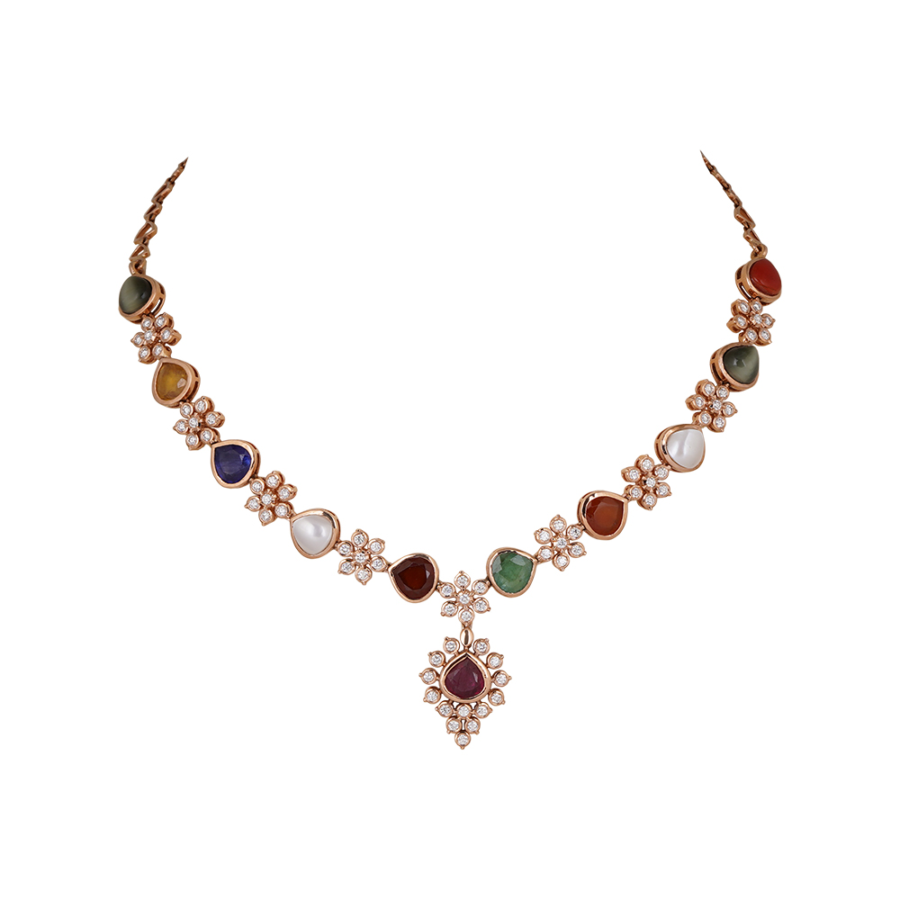 A jewel of elegance and auspicious charm, this diamond Navarathna necklace is beautifully designed with tear-drop shaped Navarathna gemstones, each radiating vibrant color and meaning. The gemstones are set amidst delicate six-petaled diamond floral motifs, adding sparkle and grace to the design. At the heart of the necklace lies a small floral pendant, featuring a vivid ruby center encircled by shimmering diamonds, symbolizing prosperity and timeless beauty. Blending heritage with brilliance, this necklace is a perfect adornment for weddings, festive occasions, and as a treasured heirloom. Purity: Gold (Diamond Setting) Design: Floral Necklace with Ruby-Centered Pendant Stones: Tear-Drop Navarathna, Diamonds & Ruby Style: Traditional symbolism with modern finesse
