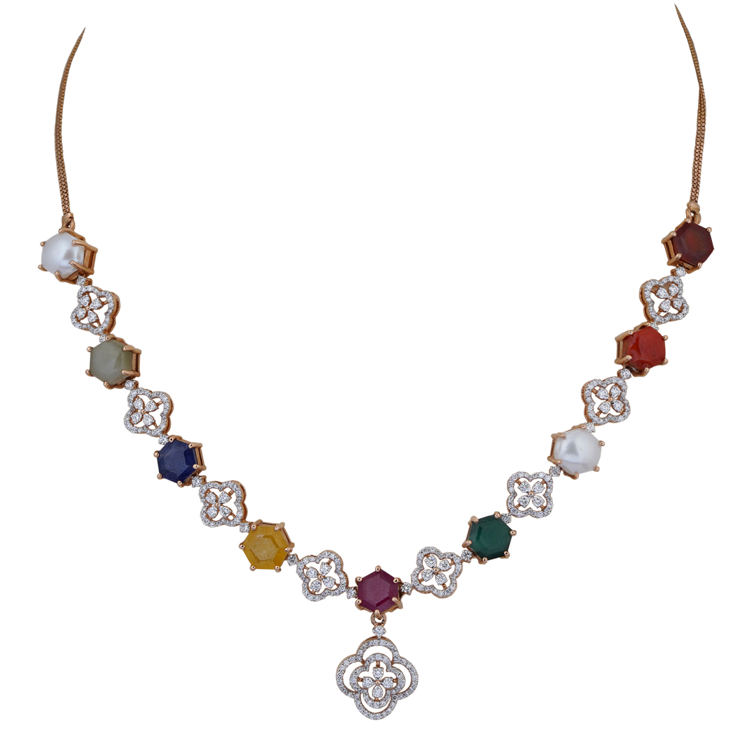 Delicately designed to complement a Navarathna necklace, these 18Kt rose gold earrings feature a graceful four-petal floral stud that flows into a striking ruby drop structured in a unique pentagonal shape. The vivid red ruby adds a bold touch of elegance, while the rose gold setting enhances its warmth and charm. Perfectly balancing tradition with modern artistry, this pair is an exquisite choice for festive occasions, weddings, or as a statement jewel to elevate your ensemble. Purity: 18Kt Rose Gold Design: Four-Petal Floral Stud with Pentagonal Ruby Drop Stones: Ruby Style: Elegant match to Navarathna Necklaces