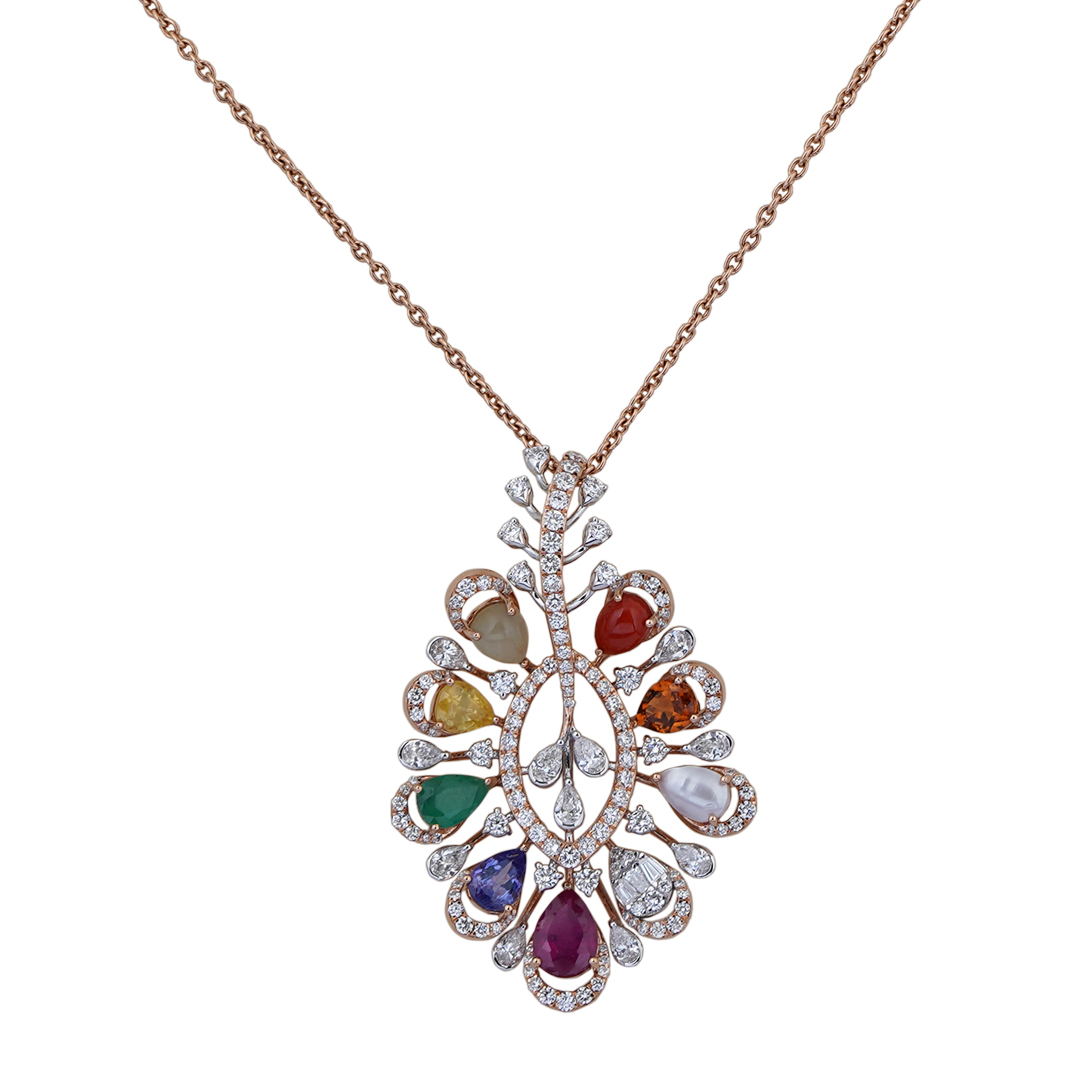 A jewel that blossoms with beauty and meaning, this 18Kt rose gold pendant with chain is exquisitely crafted in the form of a radiant flower. Each petal is adorned with one of the nine sacred Navarathna gemstones, symbolizing prosperity, harmony, and divine energy. Surrounding the vibrant gems is a dazzling bed of diamonds in varied cuts, carats, and clarity, creating a unique brilliance that catches the light from every angle. Paired with a matching chain, this pendant is a perfect union of tradition and luxury—an auspicious treasure for festive occasions, weddings, or timeless everyday elegance. Purity: 18Kt Rose Gold Design: Floral Pendant with Matching Chain Stones: Navarathna (9 Gemstones) & Multi-cut Diamonds Style: Traditional symbolism with contemporary sparkle