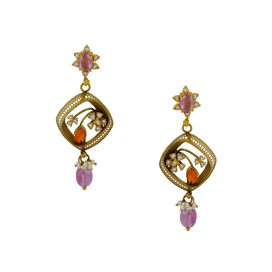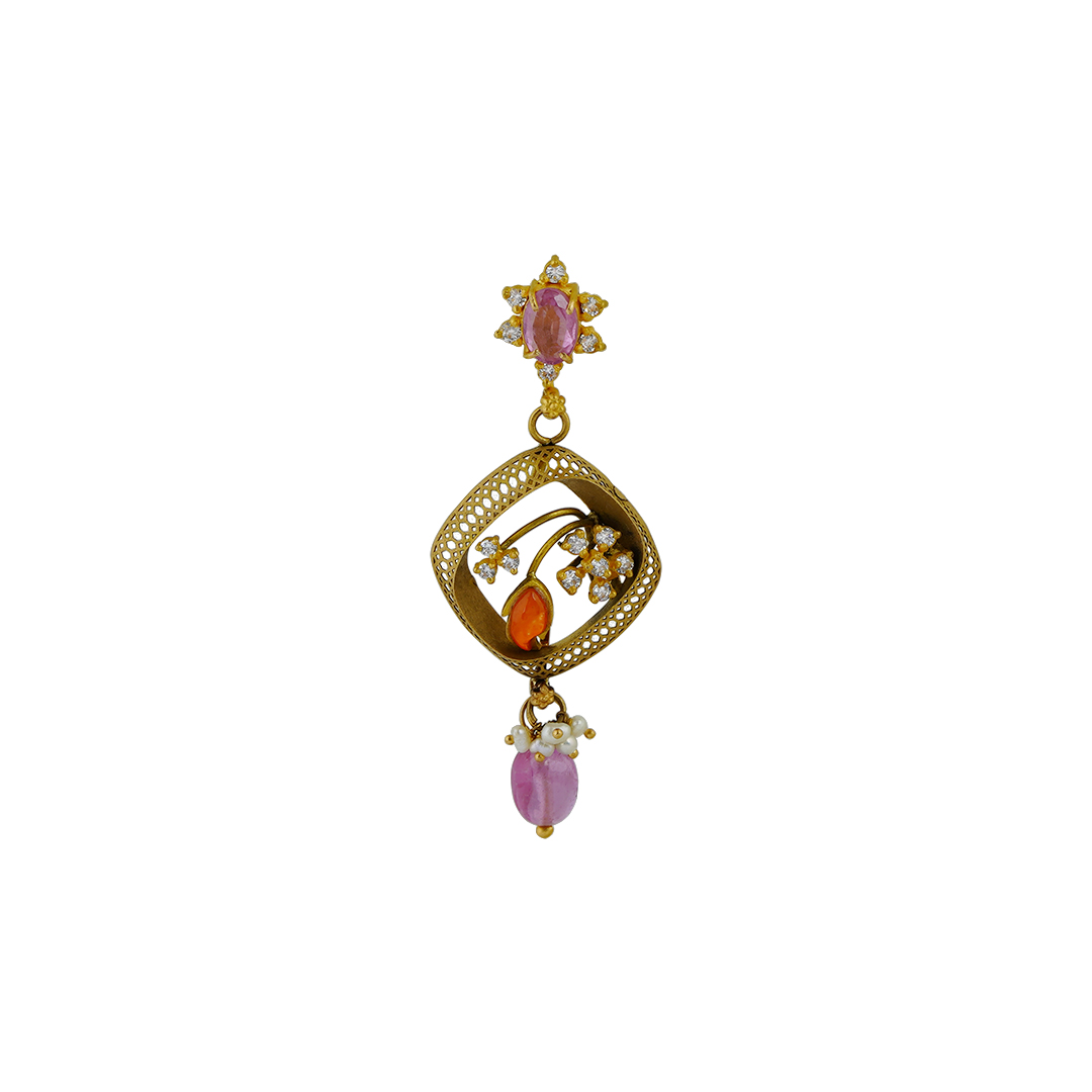 Celebrate elegance with this beautifully crafted gold haram set paired with matching earrings, designed to bring a vibrant charm to your traditional look. Inspired by delicate floral artistry, this piece features a stunning six-petal floral pendant created by joining intricate mesh-patterned squares, giving the design both depth and graceful symmetry. Each mesh square is adorned with two petite floral motifs studded with sparkling zircons, while the leaf details are highlighted with rich orange enamel, adding a striking contrast to the soft hues of the design. The flowers are further enhanced with baby pink stones, bringing a subtle feminine touch that beautifully complements the brilliance of the gold. The pendant and chain are elegantly finished with sugar pearl hangings and baby pink beads, creating gentle movement and a luxurious traditional appeal. Paired with matching floral earrings, this set is perfect for festive occasions, weddings, and special celebrations. A harmonious blend of floral craftsmanship, colorful enamel work, and delicate stone setting, this haram set effortlessly enhances both traditional sarees and modern ethnic outfits. gold haram set, floral design haram, baby pink stone jewellery, enamel work gold haram, zircon studded necklace set, traditional long haram with earrings, designer gold jewellery.
