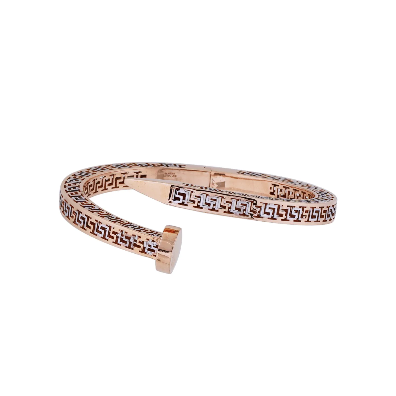 A 18k Rose gold with the touch of rhodium on it. This special geometrical patterned kada to suit all your look. Make it yours today.