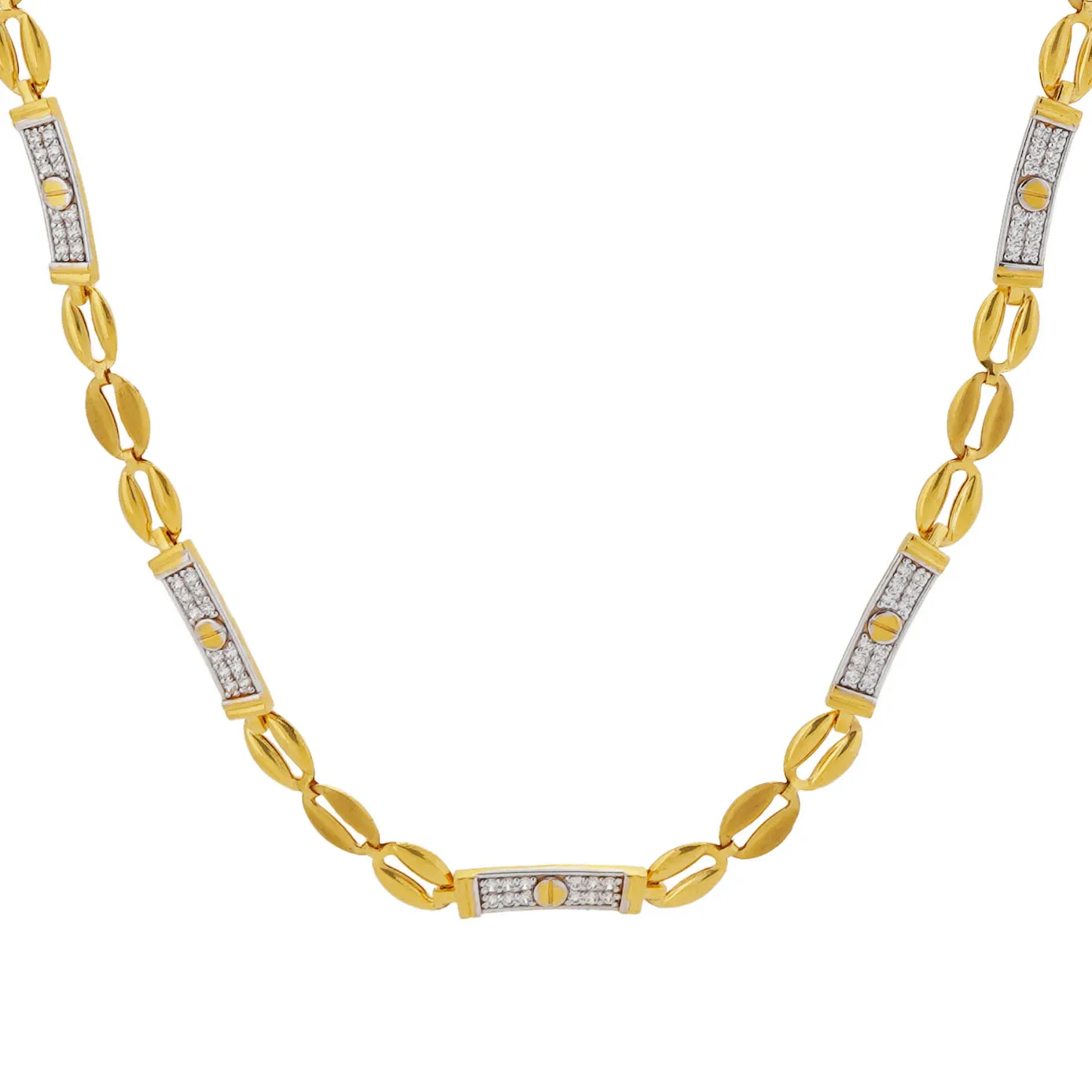 A royal neck piece to adorn your Royal man with a royal pattern. This chain is designed in an outstanding design with oval stirpes and a rectangular strip studded with zircons on it to create a glaze on it.