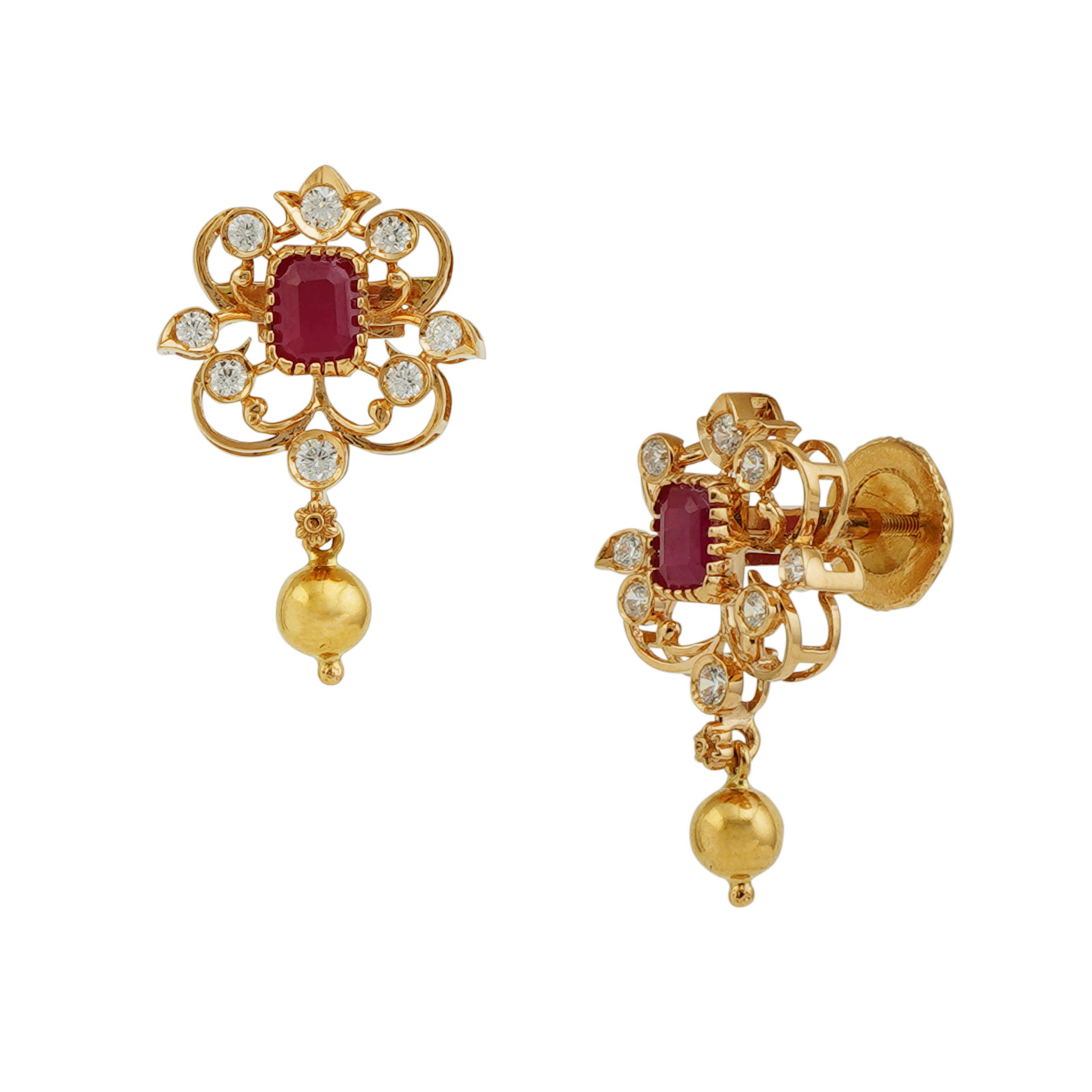At the heart of this magnificent piece lies a meticulously crafted floral motif studded with navarathnas and the master artisans have skillfully shaped each petal to replicate the delicate beauty of nature's blossoms added with the curvy peacocks to it covered with zircons and resulting this beautiful pendant with matching earrings to be embodied with elegance and sophistication.