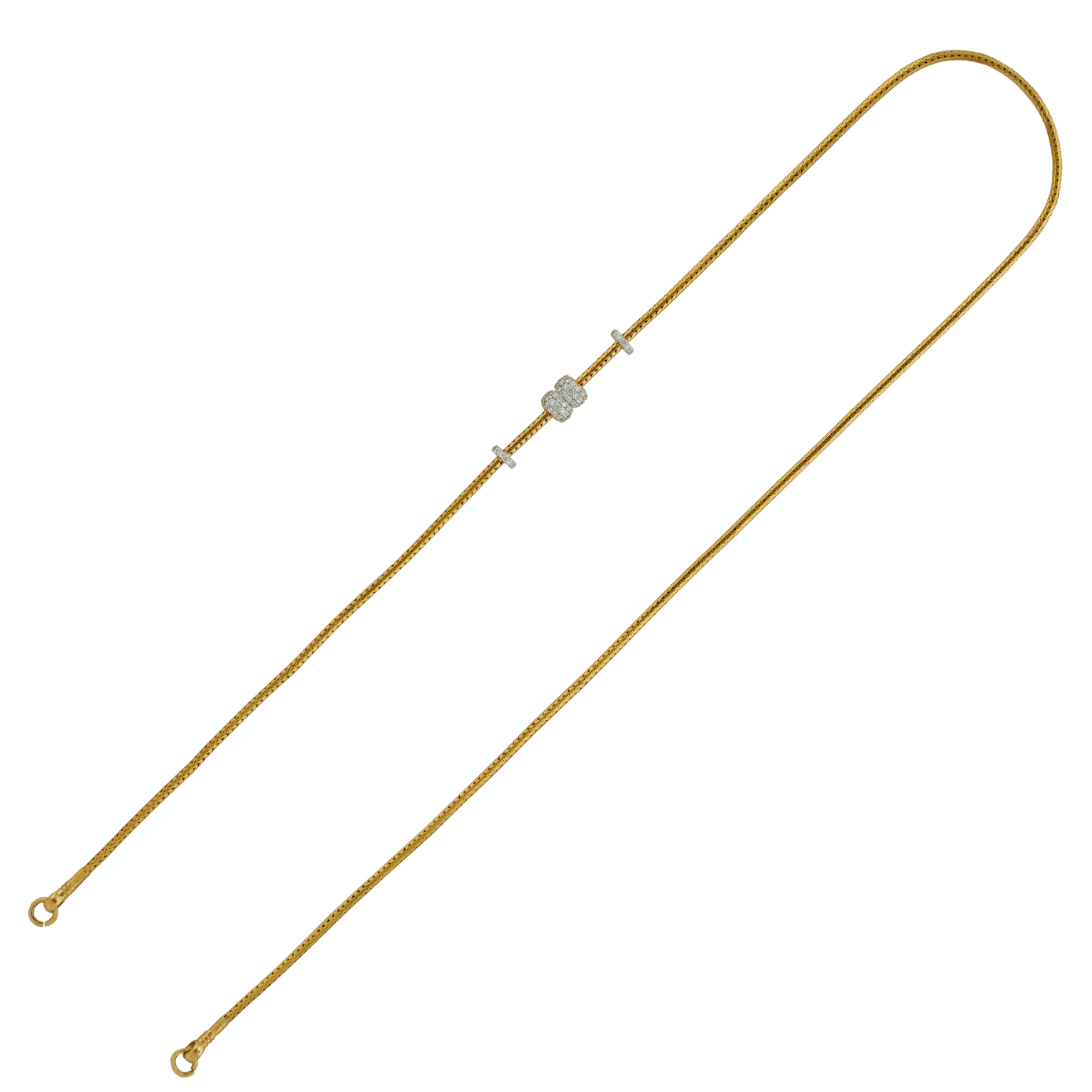 Crafted with attention to detail, the simple mugappu showcases the mesmerizing array of round-cut diamonds, carefully set to maximize their brilliance and shine. The diamonds gracefully encircle the mugappu creating a captivating aura of radiance on precious 22kt gold, offering a warm and lustrous backdrop in a grand omega pattern.