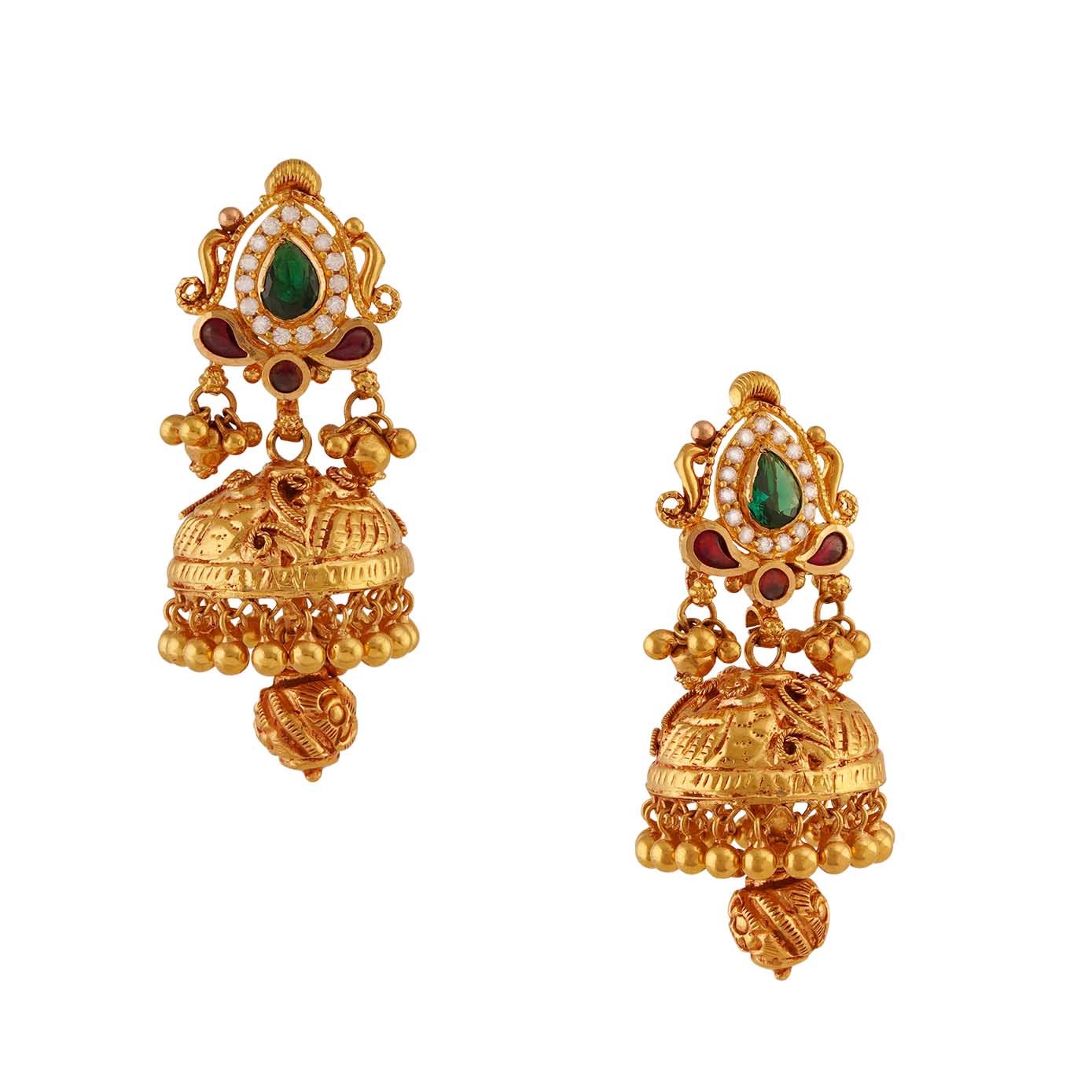 Draping your ears in a melody of antiquity, our Antique Jumkka emerges as a masterpiece of intricate carvings, adorned with a burst of colors through stones and enamels. Each detail tells a story of timeless craftsmanship, while multiple gold ball bead hangings add a playful sway to this vintage-inspired adornment. Wear these jumkkas to embrace a fusion of history and vibrancy, an ode to the artistry that transcends eras.