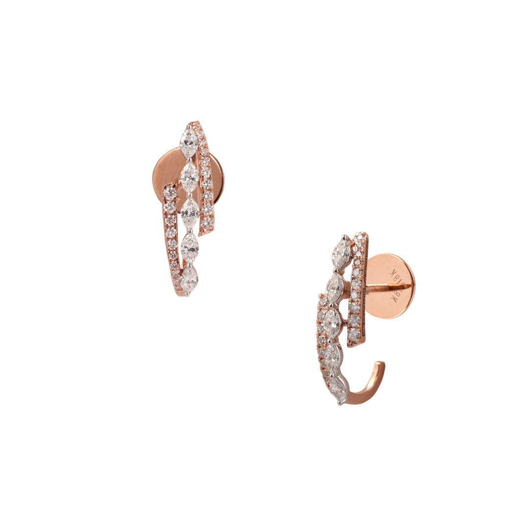 Crafted in lustrous 18KT rose gold, these huggie-style earrings feature a secure Bombay screw closure for comfort and ease. The design showcases two concentric rims of dazzling round-cut diamonds, meticulously set to create a radiant border. At the heart, a cluster of marquise-cut diamonds forms an exquisite centerpiece, adding a touch of sophistication. Multiple miniature diamonds are intricately embedded along the rims, enhancing brilliance from every angle. Perfect for both everyday elegance and special occasions, these earrings embody timeless luxury with a modern flair.