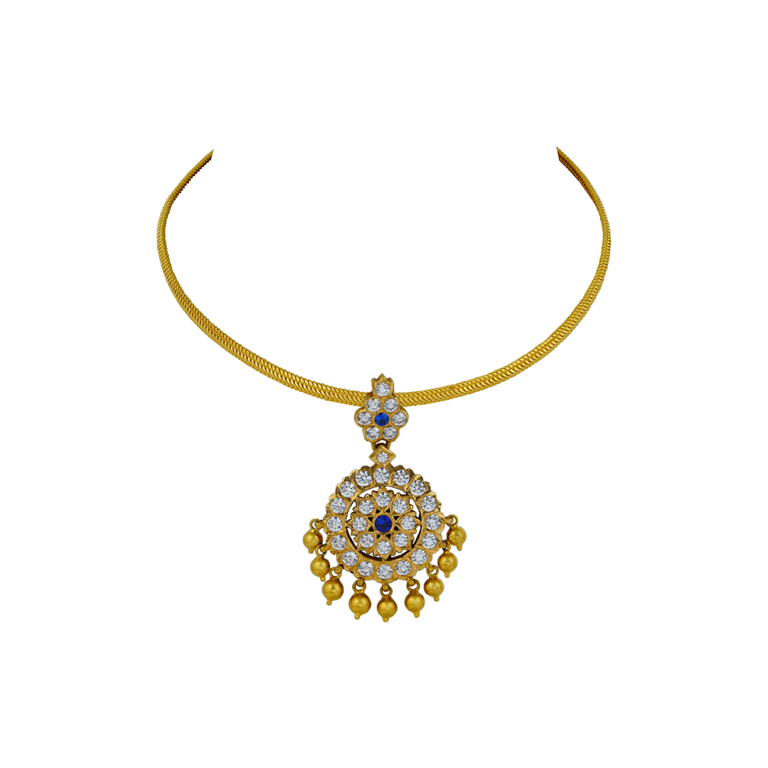 Celebrate the richness of South Indian heritage with this exquisite 22KT Gold Attigai Necklace, a true embodiment of traditional elegance and cultural pride. Designed as a classic collar-style chain, this attigai sits gracefully around the neckline, creating a bold yet refined statement. The plain gold collar chain is beautifully paired with a grand round pendant, forming a perfect balance of simplicity and grandeur. The smooth, polished finish of the chain enhances the prominence of the circular pendant, making it a versatile piece that complements all traditional outfits — from silk sarees to bridal ensembles. Crafted in pure 22KT gold, this traditional necklace reflects fine craftsmanship, durability, and timeless appeal. Ideal for weddings, festive occasions, temple visits, and family celebrations, the attigai necklace remains a must-have in every classic jewellery collection. Product Highlights: ✔ Crafted in pure 22KT gold ✔ Traditional attigai (collar-style) necklace design ✔ Elegant plain collar chain ✔ Grand round pendant centerpiece ✔ Perfect for weddings, festive wear & bridal styling ✔ Complements all traditional outfits A graceful blend of tradition and sophistication — this 22KT gold attigai necklace adds royal charm and cultural elegance to every special occasion