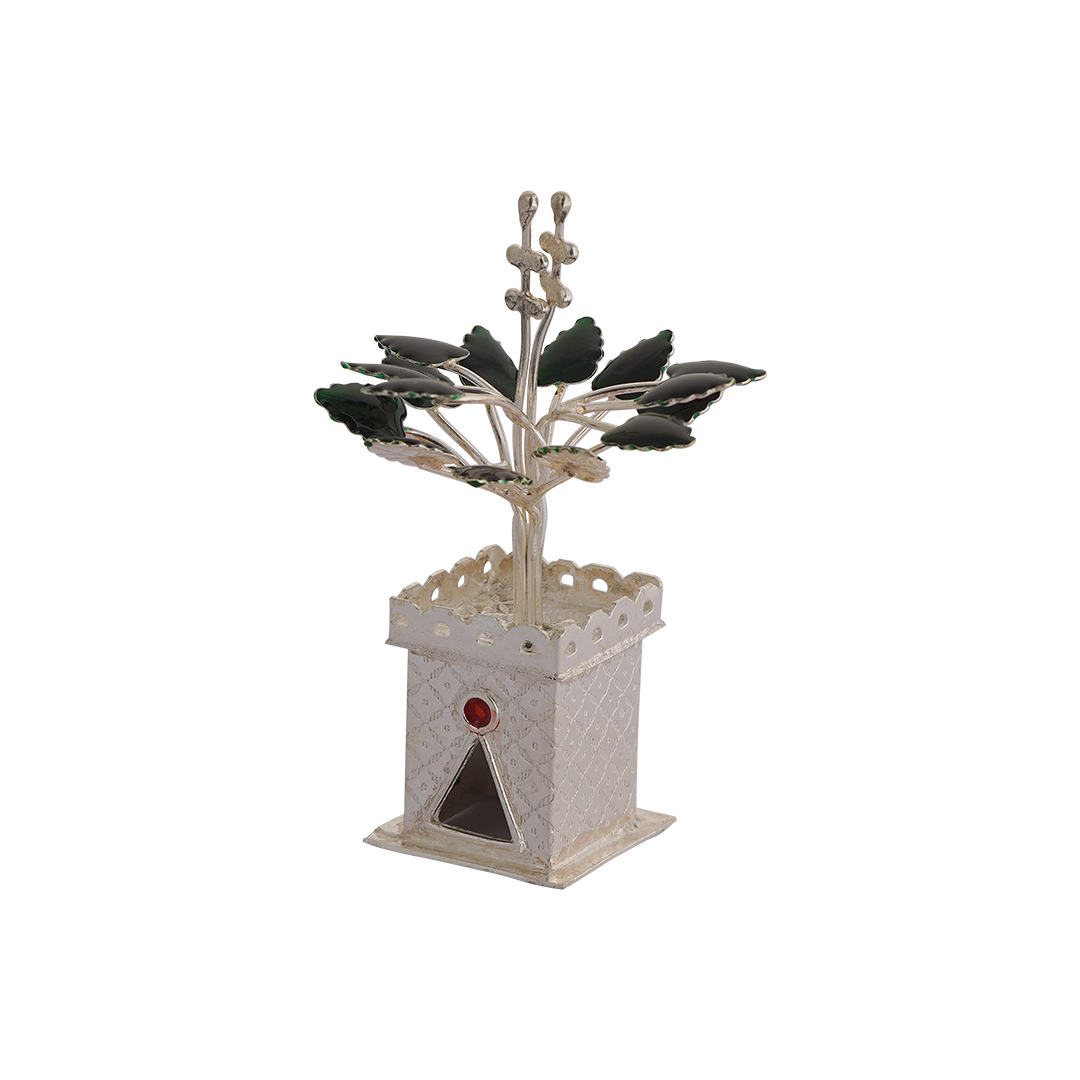 Bring home divine blessings with this beautifully crafted 92.5 Sterling Silver Tulsi Pot (Tulsi Maadam), inspired by the traditional terracotta tulsi planter design. Thoughtfully created in authentic 92.5 pure silver, this sacred piece reflects devotion, purity, and timeless craftsmanship. Designed to resemble the classic terracotta model pot, this silver tulsi maadam beautifully captures traditional aesthetics while offering the elegance of sterling silver. The finely detailed Tulsi leaves are enhanced with green enamel coating, adding a vibrant and lifelike touch that elevates its visual appeal. Symbolizing prosperity, protection, and spiritual well-being, the Tulsi plant holds immense importance in Hindu households. This silver tulsi pot is ideal for pooja rooms, festive decorations, housewarming ceremonies, weddings, and auspicious gifting. Product Highlights: ✔ Crafted in certified 92.5 Sterling Silver ✔ Inspired by traditional terracotta Tulsi maadam design ✔ Tulsi leaves finished with green enamel coating ✔ Intricate detailing with elegant craftsmanship ✔ Ideal for pooja rooms, festive décor & sacred gifting ✔ A meaningful symbol of devotion and prosperity A graceful blend of tradition and elegance — this silver Tulsi maadam adds sacred charm and spiritual beauty to your home ✨