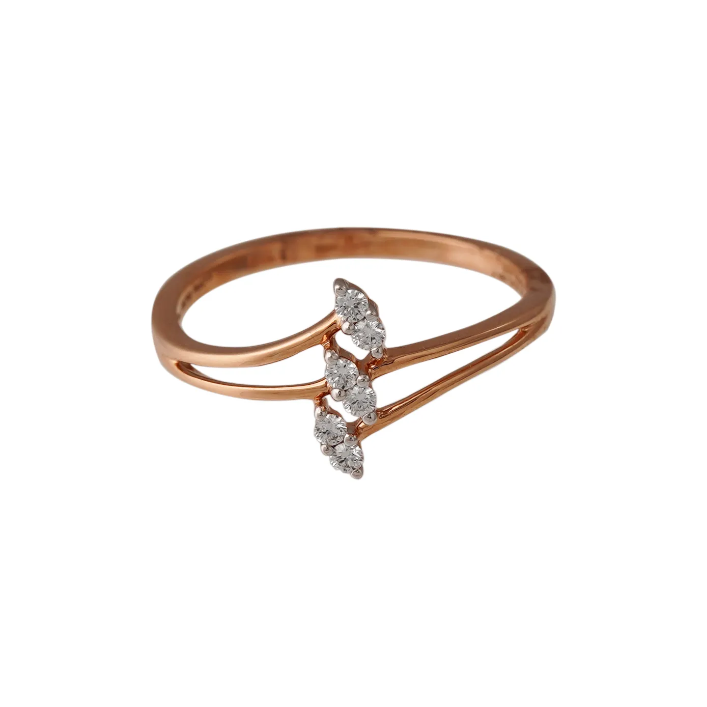 One elegant piece of rose gold ring divides into two rows to firmly hold three layers of diamonds. A pretty ring with an artful design that sparkles from your finger. This ring is slender and stable and matches well with formal party vibes.