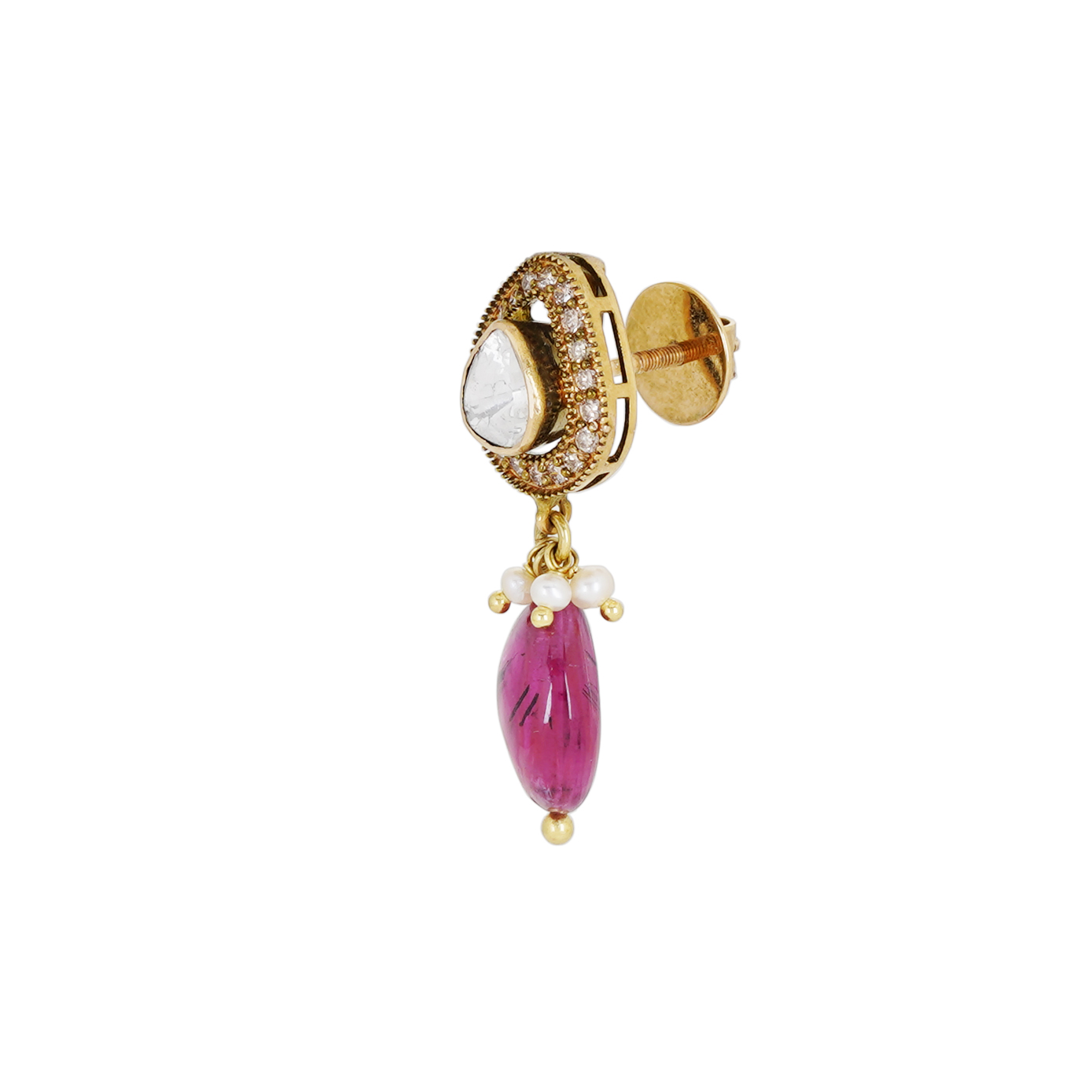 A matching hanging stud with uncut diamonds and mini diamond border added to a remarkable uncut diamond necklace, fashioned in a unique geometrical design. This necklace captivates with its raw beauty, blending uncut diamonds in an intricate geometry that pays homage to traditional craftsmanship.