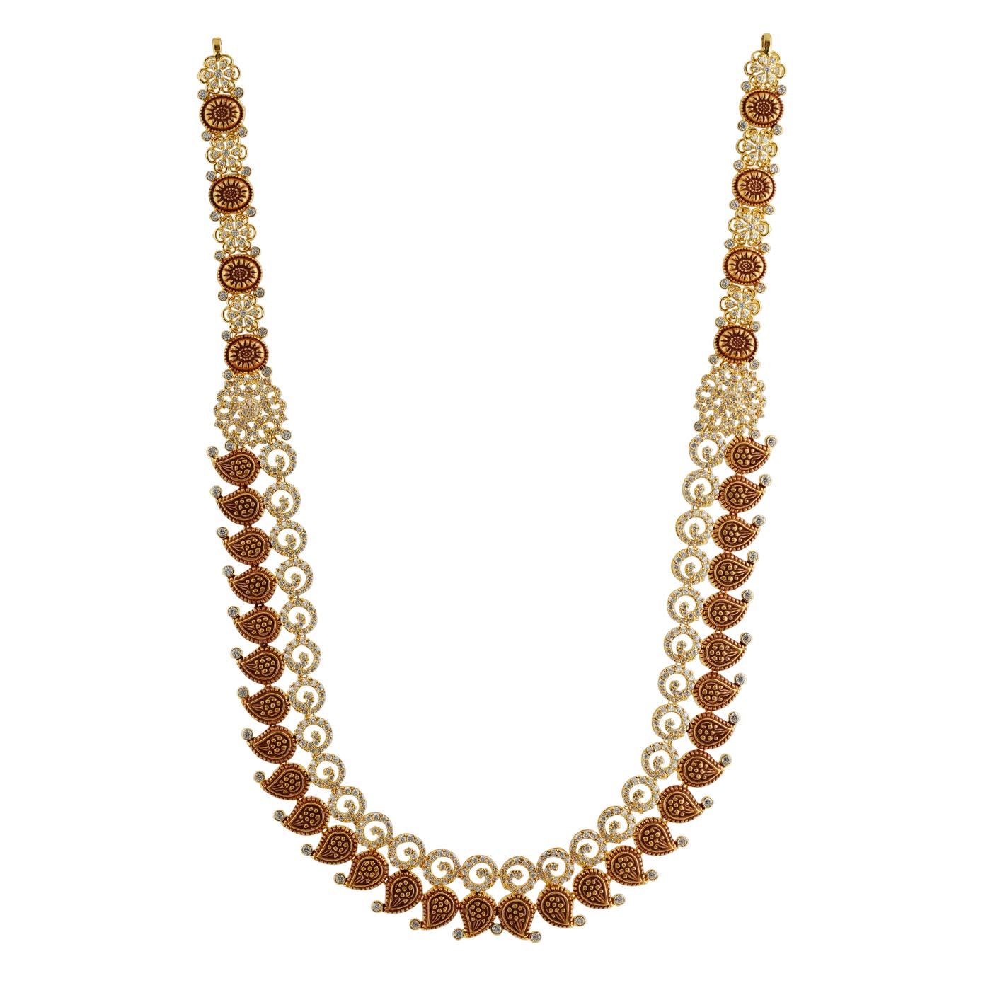 Embark on a journey of opulence with our Zircon-studded haram necklace, a dazzling testament to intricate craftsmanship. This resplendent piece features a mesmerizing interplay of floral patterns and paisley motifs, each intricately adorned with glistening zircon gemstones. The floral elements evoke the beauty of a blossoming garden, while the paisley motifs infuse a touch of tradition and grace. The zircon stones, with their ethereal sparkle, add an unparalleled radiance to the necklace. Adorn yourself with this haram to experience the fusion of timeless elegance and contemporary glamour in one exquisite masterpiece.