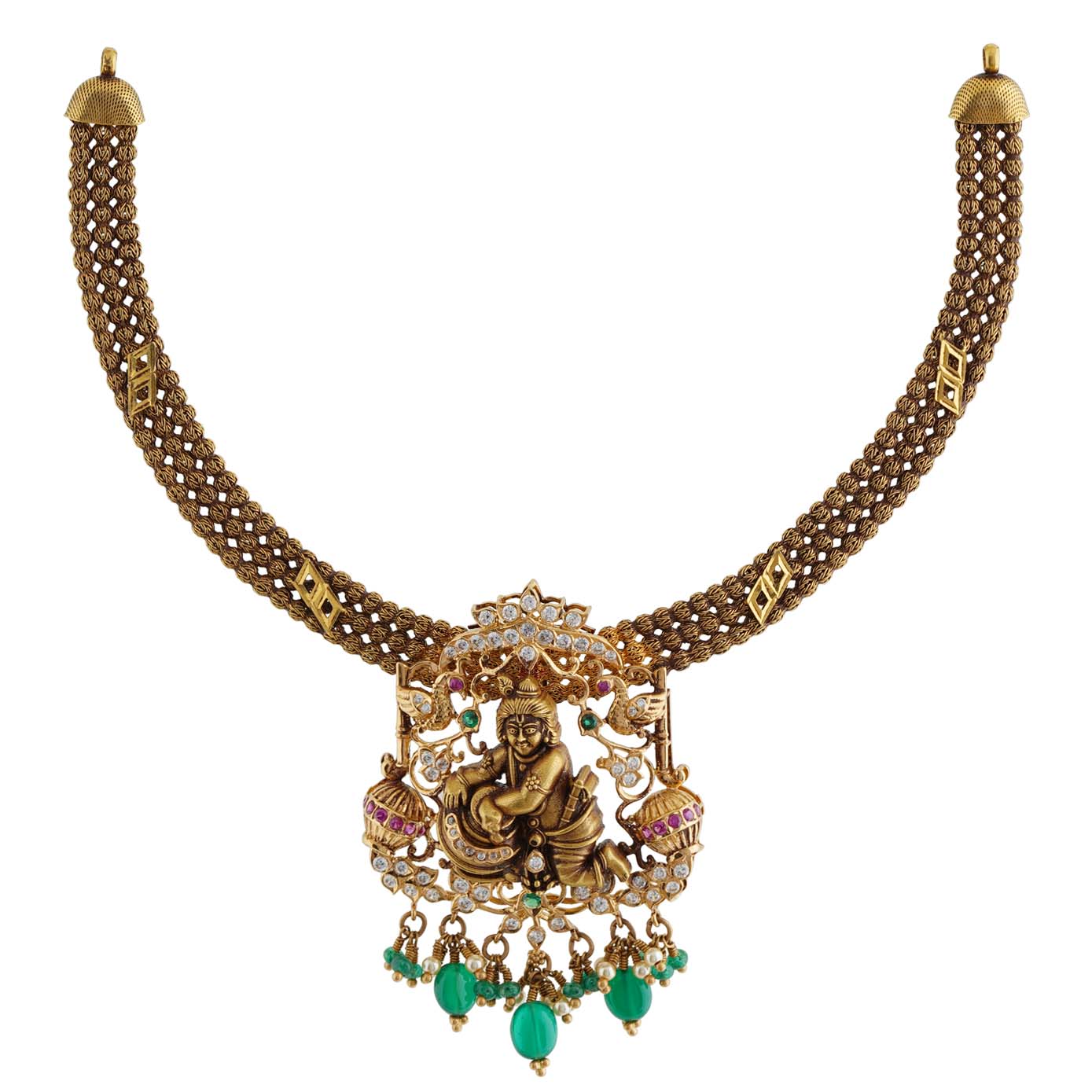 Introducing the captivating "Heritage Charms" Antique Pendant Chain, a treasure of timeless beauty that transports you to a bygone era of elegance and grace. This exquisite piece of jewelry with cute little benna eating Krishna Designs studded with zircons and color stones ended with green beads hanging on it is a celebration of the past, crafted with meticulous attention to detail and infused with the allure of antiquity.