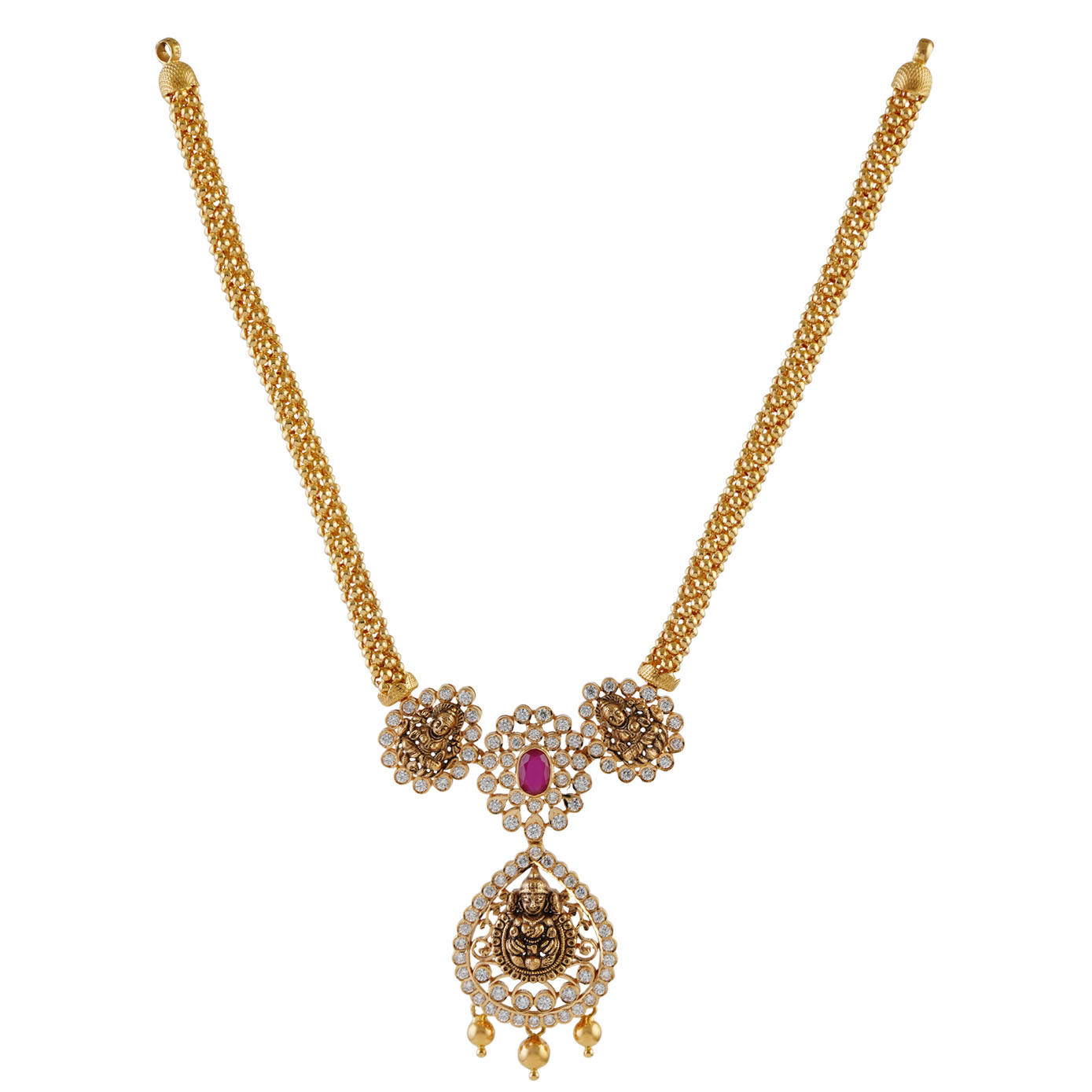 This adorable necklace exudes charm and elegance in a petite package. The necklace features dainty zircon flowers nestled among shimmering zircon stones, creating a delicate and enchanting design. At its heart, a Lakshmi motif adds a touch of divinity to the piece, symbolizing prosperity and grace. What truly sets this necklace apart is the uniquely patterned chain, offering a refreshing twist on traditional designs. This little necklace is a perfect blend of beauty and creativity, ideal for those who appreciate both simplicity and sophistication in their jewelry.