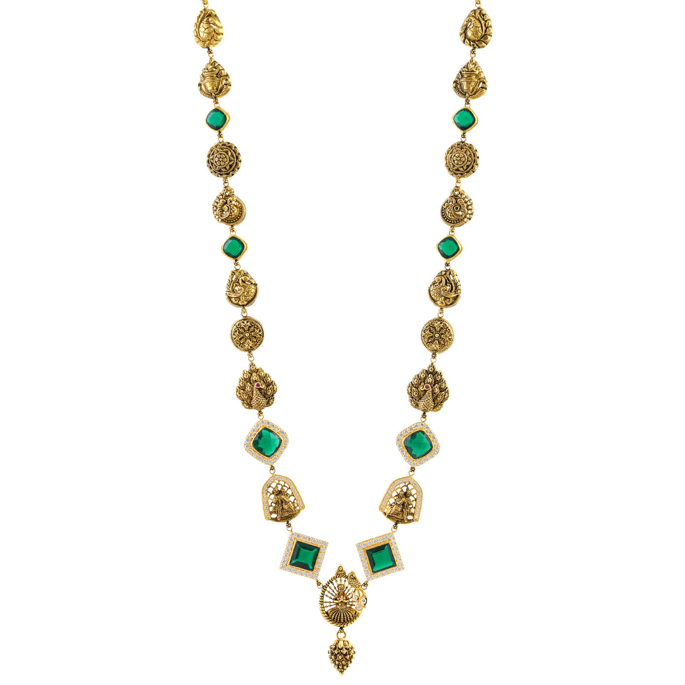 This long haram necklace is a true masterpiece of artistry and elegance. Crafted in a trendy yet timeless style, it boasts a mesmerizing combination of emeralds and zircons that lend it an enchanting sparkle. What truly sets this piece apart are the unique motifs that adorn the single line haram. In the center, there are dancing women, their graceful forms captured in intricate detail. A gold grape bead adds a touch of opulence to the design. As you move along the haram, you'll encounter Radha and Krishna, seated on an arch window, evoking the timeless love story. A full-feathered peacock, a floral mandala pattern, Annapakshi, and Poorna Kumbam are all gracefully incorporated into this piece, showcasing the richness of Indian culture and tradition. The haram is finished in an antique style, adding a touch of vintage charm to this modern work of art. It's a necklace that tells a story, capturing the essence of tradition, beauty, and spirituality in one exquisite piece.
