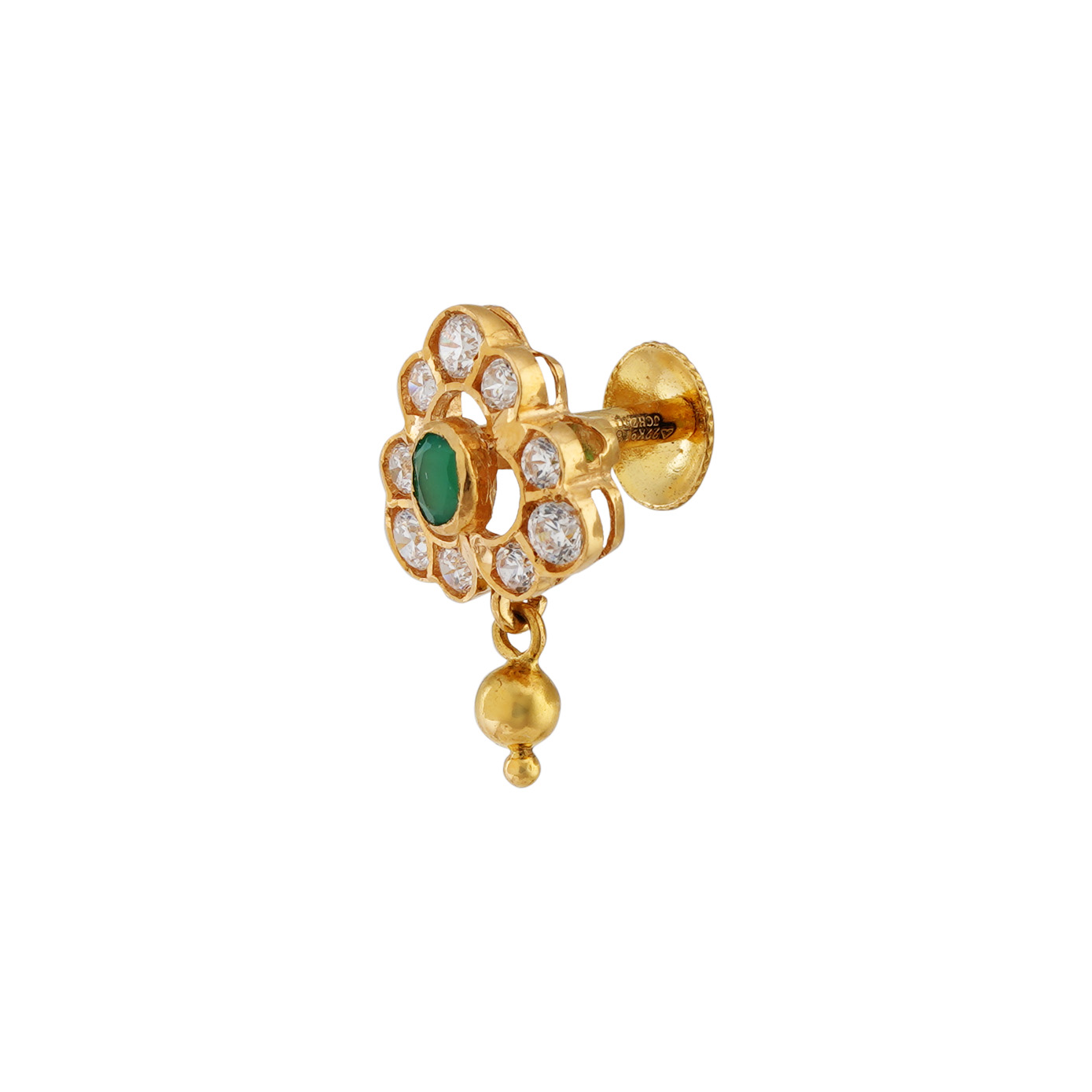 This exquisite earring features a timeless 3-petal flower design. The delicate, white zircon-studded borders add a touch of sparkle and sophistication. Nestled at the heart of this floral beauty is a semi-precious emerald stone, radiating natural elegance and charm. To complete the classic look, a single, gleaming gold bead dangles gracefully, adding a touch of opulence to this gracefully designed earring. It's a piece that effortlessly combines simplicity and sophistication for a truly classic appeal.