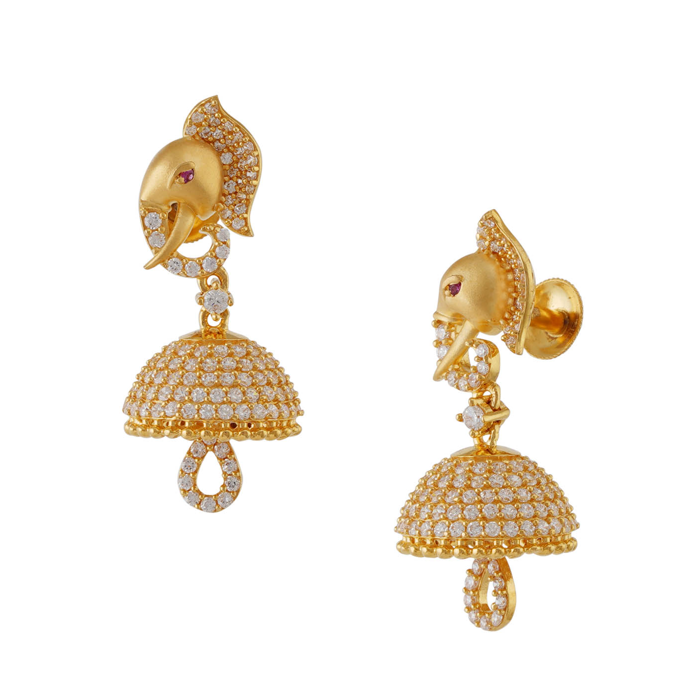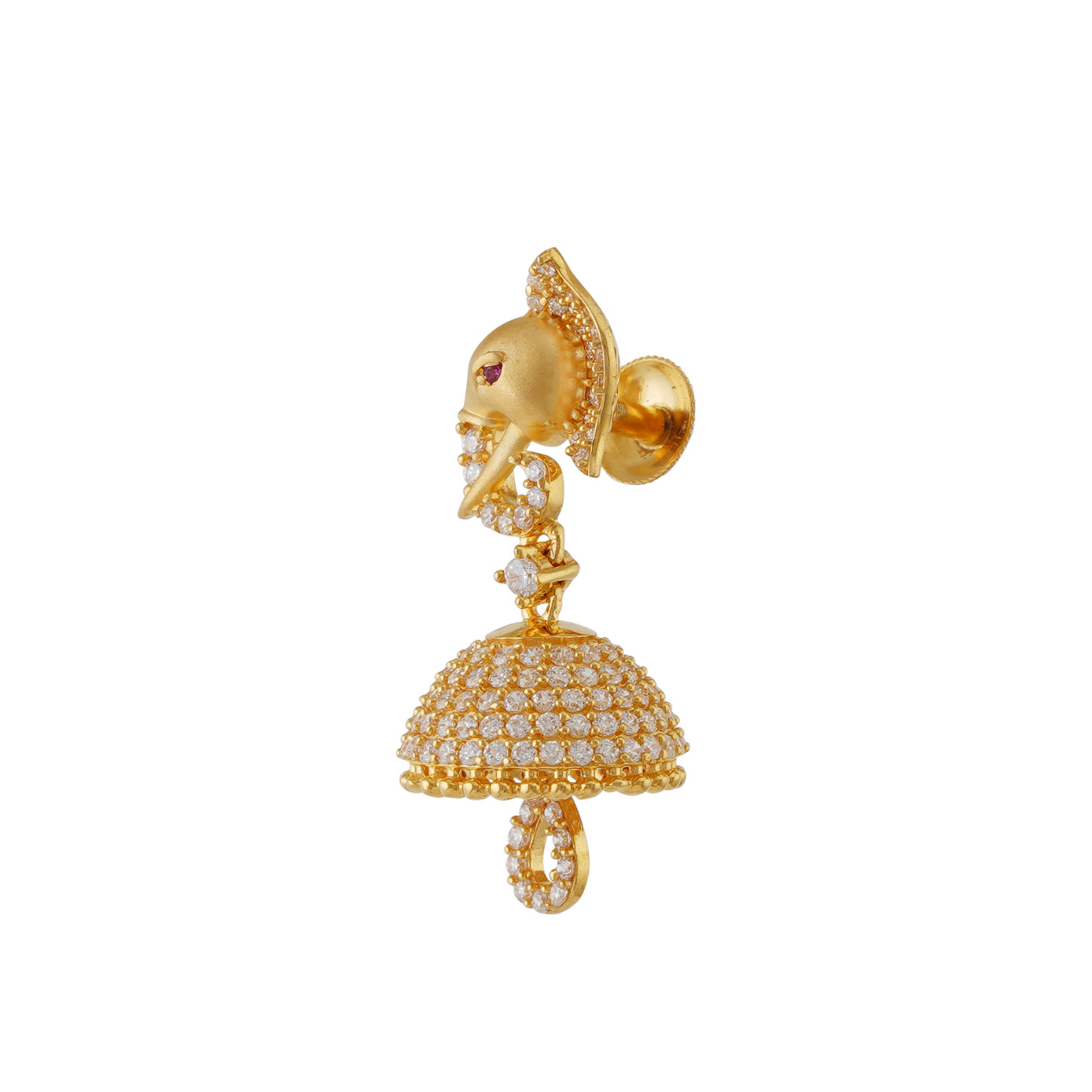 The designer jumkka is a captivating piece of jewelry that combines traditional and contemporary elements. Its standout feature is the elephant head-shaped top, exquisitely crafted with intricate details. The entire jumkka is adorned with shimmering zircon stones, creating a dazzling and opulent appearance. This fusion of a majestic elephant motif and the brilliance of zircon studding makes it a statement accessory, perfect for those who appreciate artistry and elegance in their jewelry.