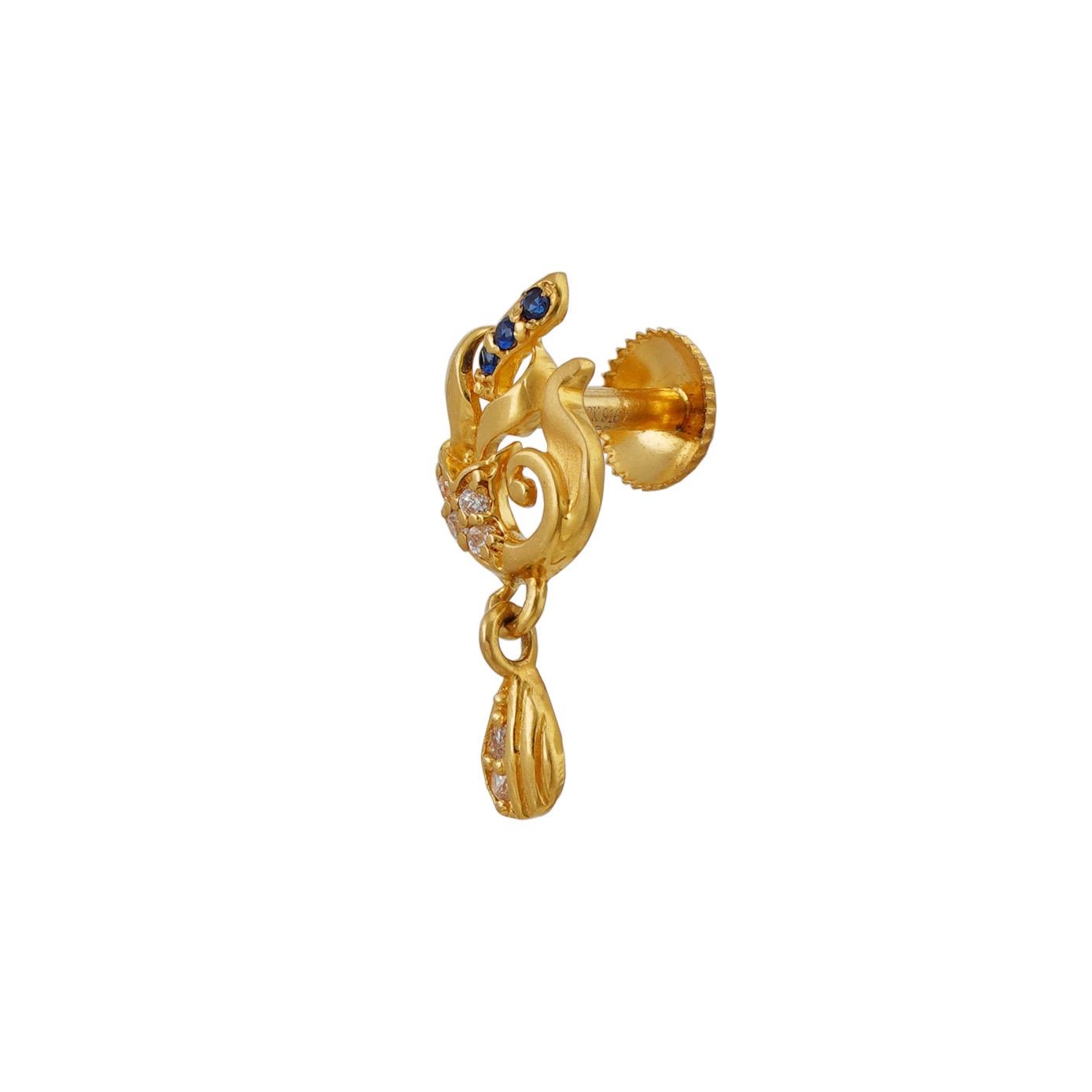 "Indulge in the beauty of our Floral Stud Earring, where a single blue stone petal gracefully contrasts with sparkling zircons. The tear drops, meticulously crafted from 22k gold, add a touch of opulence to this exquisite piece. Embrace the allure of nature's charm and elegance in this timeless creation."