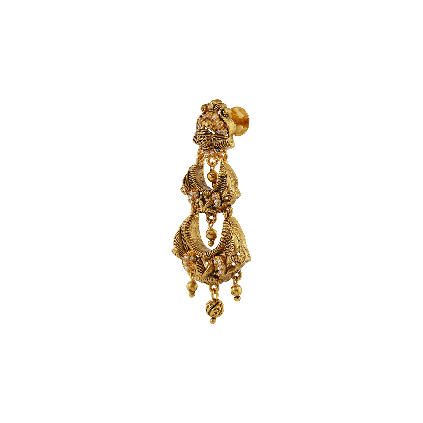 "Elevate your elegance with our Double-Layered Antique Chandhbali, a masterpiece of intricate engravings and timeless design. The stunning peacock stud top adds a regal touch, while the rich detailing on the layers creates an aura of sophistication. Embrace the allure of heritage and craftsmanship with these exquisite earrings, destined to make a statement of grace and opulence."