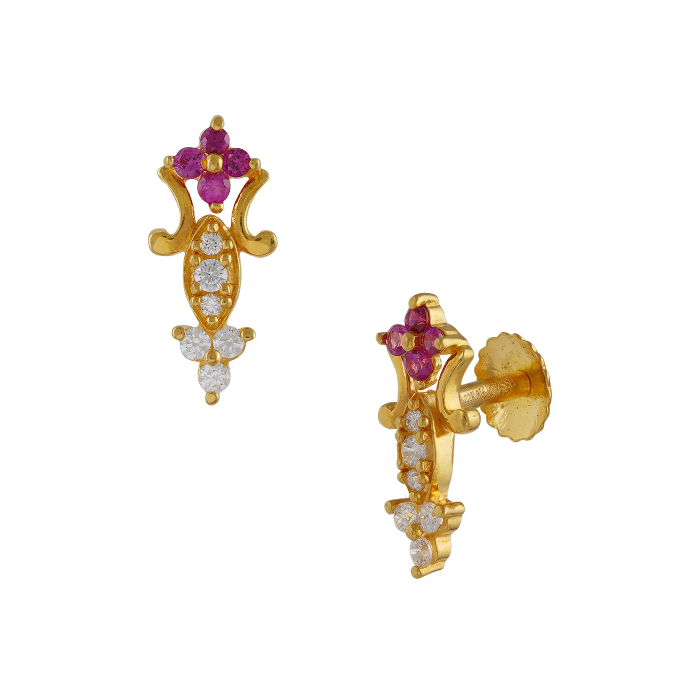This stunning 22k gold earring is a true masterpiece of elegance and sophistication. Its unique floral pattern showcases a delicate and enchanting design. Pink stones, reminiscent of blooming flowers, grace the petals of this exquisite piece, infusing it with a touch of feminine charm. Each petal is further accentuated by the shimmering brilliance of white zircons, adding a captivating sparkle. These earrings are a remarkable blend of timeless beauty and modern allure, making them the perfect choice to adorn any special occasion with grace and style.