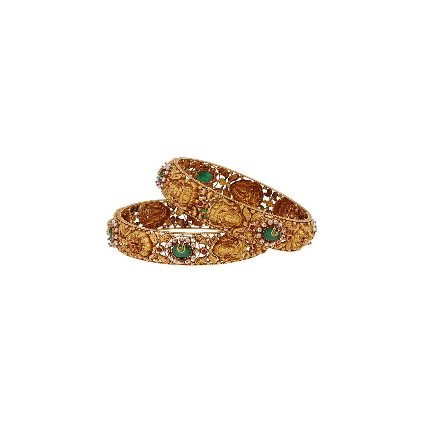 "Immerse yourself in the divine beauty of our bangle, a captivating creation that seamlessly blends tradition with contemporary elegance. The cutwork pattern skillfully distinguishes two graceful depictions of Lakshmi, each adorned with intricate floral detailing and a vibrant emerald center, radiating prosperity and grace. A delicate filigree adds an extra layer of artistry to this unique piece. Surrounding these divine motifs are pearl petals, creating a harmonious balance of opulence and simplicity. Elevate your collection with this exquisite bangle, a symbol of timeless beauty and spiritual richness."