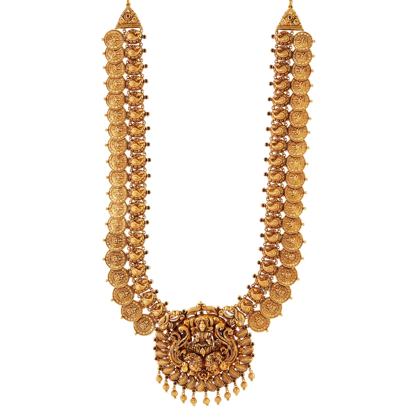 The Thanga Kaasu and mango motif combination in this haram necklace is a cherished and timeless pairing. At the heart of this piece, the divine Lakshmi pendant bestows its blessings, radiating an aura of prosperity and grace. Surrounding the pendant, you'll find another exquisite row of meticulously crafted mango motifs and lustrous gold beads. This haram is not just a necklace; it's a divine statement piece that adds a touch of elegance and spirituality to your appearance.