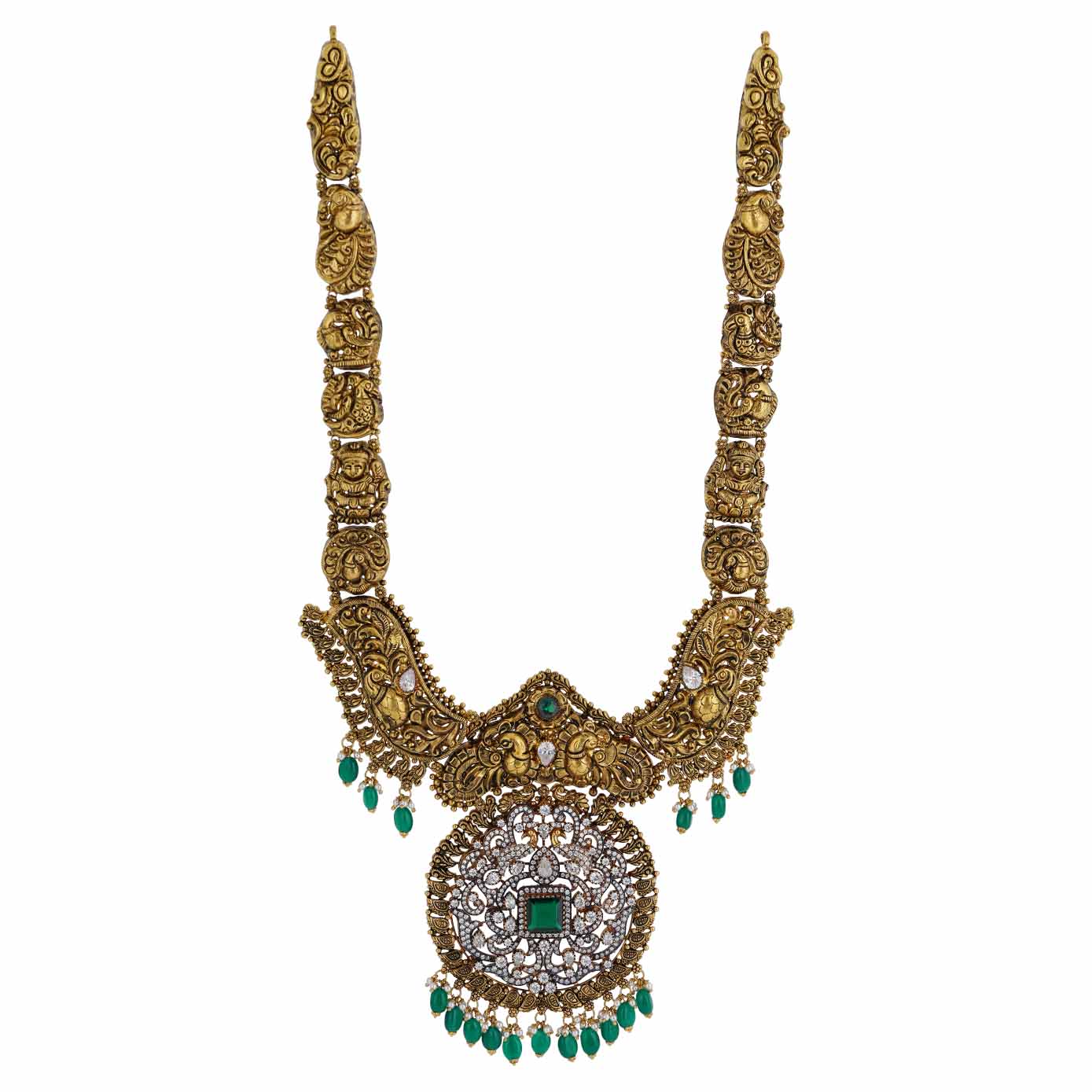 "Introducing our black antique finish long haram, a captivating embodiment of Victorian opulence in a modern context. This Rani haram takes center stage in the latest trending collection, marrying timeless elegance with contemporary flair. The sides are adorned with exquisite peacock, Annapakshi, Lakshmi, and floral motifs, showcasing intricate detailing. The main body boasts a special W-arch model, featuring enchanting Naga work that adds a touch of mystique. The central pendant, a masterpiece in itself, is resplendent with zircons and emeralds arranged in a beautiful floral vine pattern. Green bead hangings cascade gracefully, completing this haram with a flourish of regal sophistication. Embrace the allure of the past with a touch of modern allure in this Victorian-inspired jewelry masterpiece."