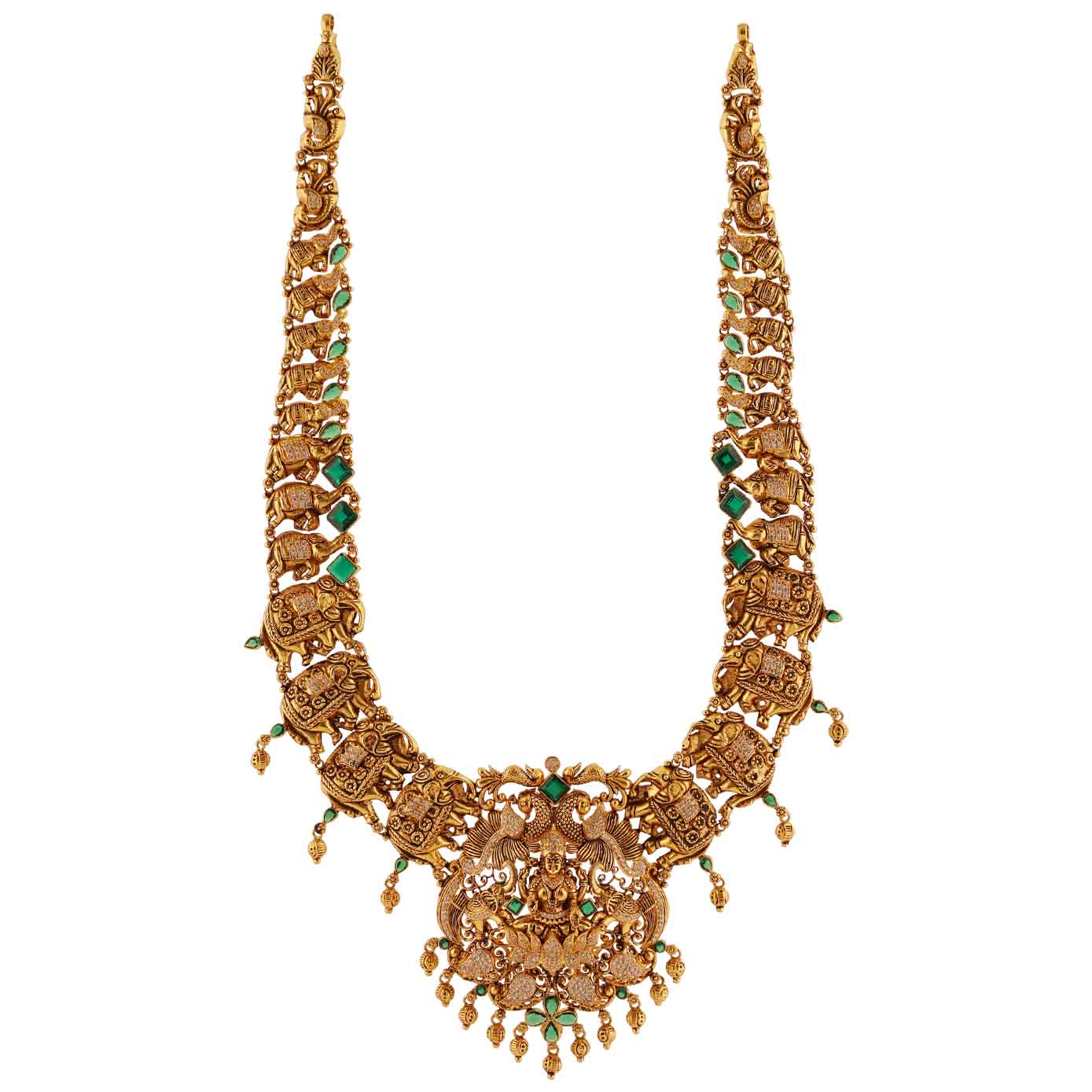 This mega haram boasts an antique yellow finish, adorned with a captivating interplay of green and white stones that illuminate its opulent design. The grandeur of this piece is elevated by intricately crafted elephants adorning the sides, symbolizing strength and majesty. The focal point is a majestic Lakshmi pendant, seated gracefully on a lotus, radiating prosperity and divinity. This single haram serves as the epitome of indulgence, fulfilling every jewelry enthusiast's cravings, and promises to be a showstopper, commanding attention and admiration whenever worn.