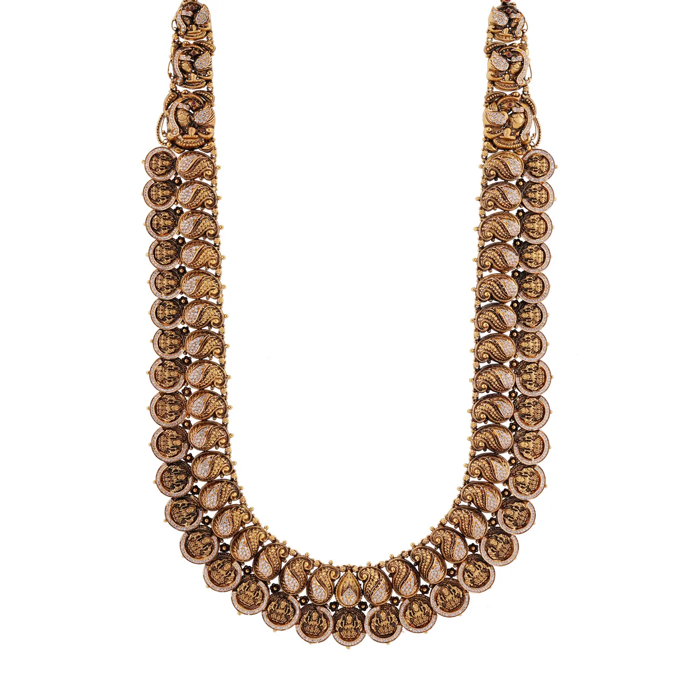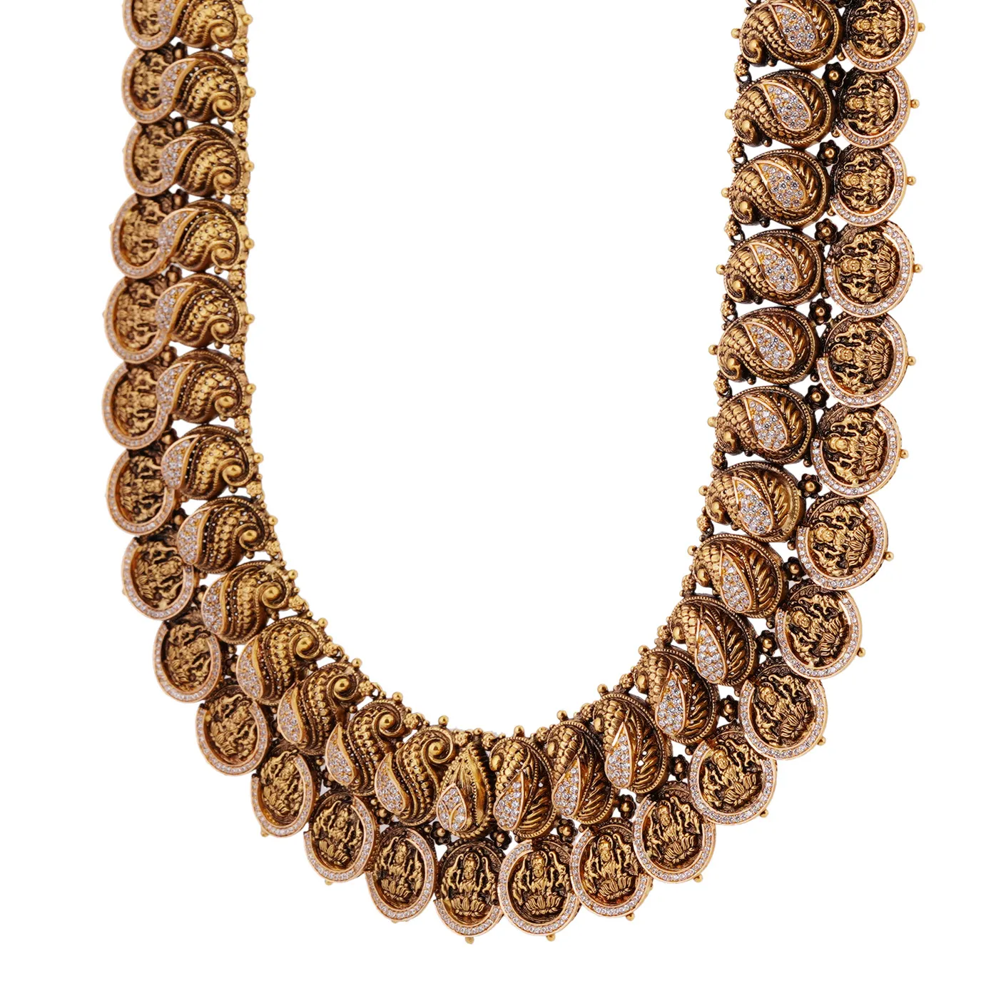 The intriguing interplay of gold and pristine white in jewelry is undeniably a game-changing combination. The mango motifs and Lakshmi coin designs, with their intricate detailing and crisp gleam, captivate attention with an understated yet resolute allure. This is the ultimate choice, especially when considering your attire for sophisticated receptions, where you wish to make an elegant and bold statement.