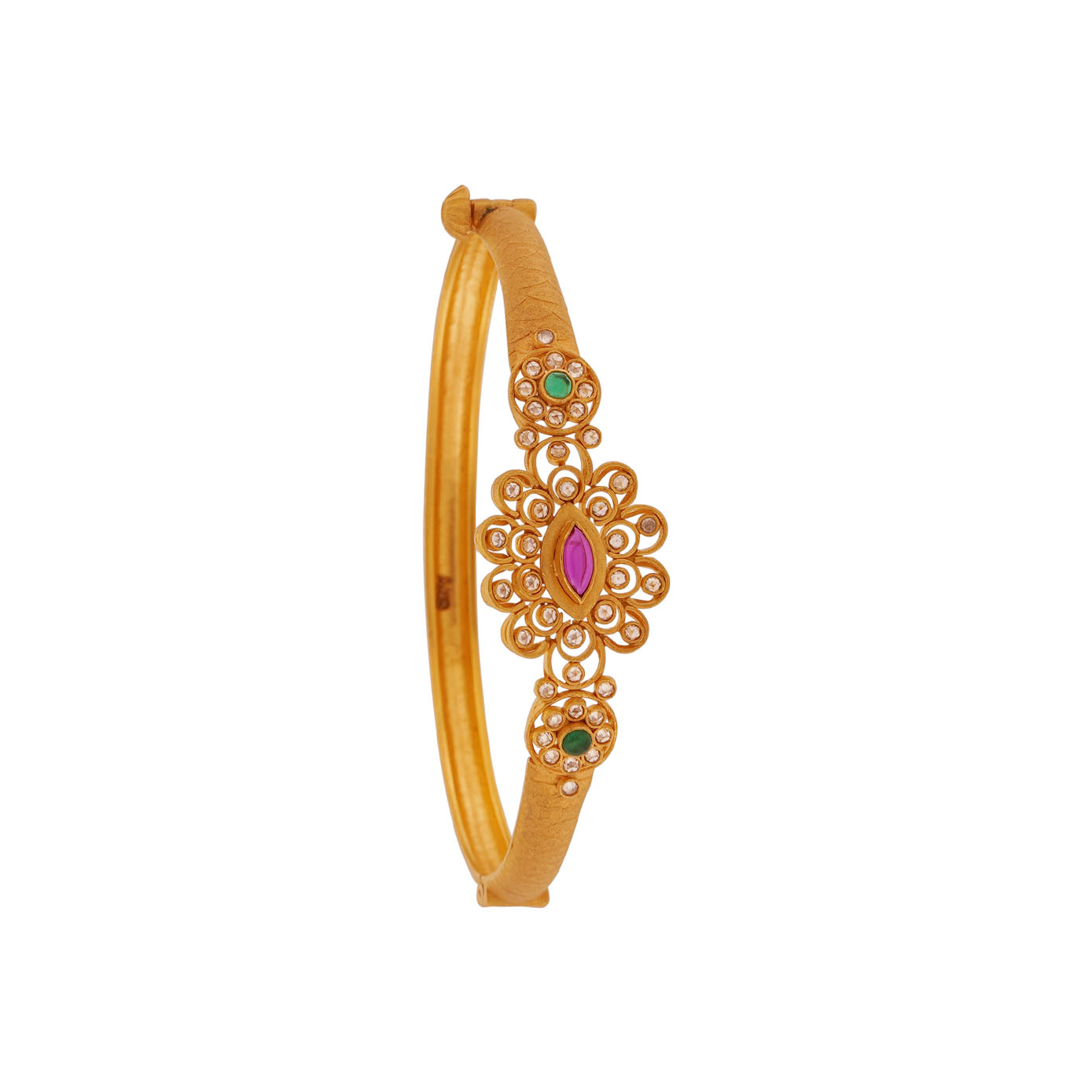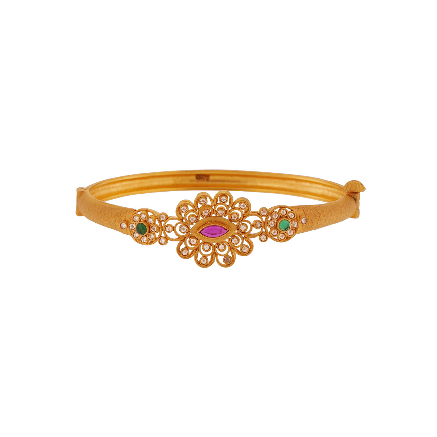 Our exquisite Filigreed Floral Bangle Bracelet, a true masterpiece of craftsmanship and elegance. Delicately crafted in a floral shape, this bracelet features intricate filigree work that adds a touch of vintage charm and sophistication. Each petal is adorned with shimmering white stones, while a stunning pink stone takes center stage, radiating beauty and grace. A lush green stone highlights the entire setting, adding a pop of color and vibrancy. Designed with convenience in mind, a discreet screw allows for easy handling and adjustment, ensuring a perfect fit every time. Whether worn alone as a statement piece or paired with other favorites, this bracelet is sure to turn heads and spark admiration wherever you go. Elevate your style with the timeless allure of our Filigreed Floral Bangle Bracelet, and let its beauty be a reflection of your own inner radiance and elegance.