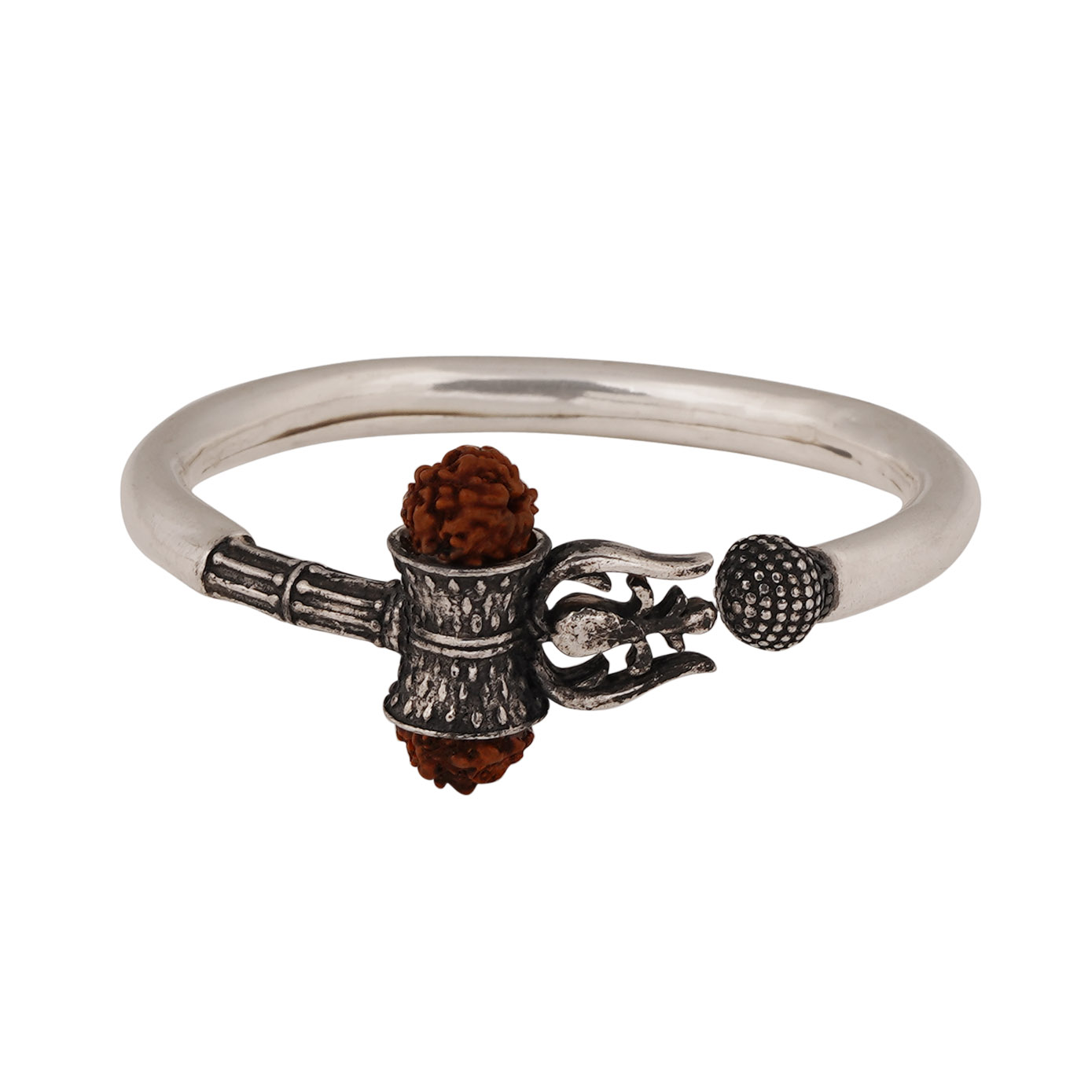 **Silver Kada with Rudraksha, Damaru, and Trishul Design in Antique Finish** Embrace spiritual elegance with this distinctive silver kada, featuring intricate symbols of Hindu mythology in an antique finish. The kada showcases Rudraksha beads, revered for their spiritual significance, alongside a Damaru (drum) and Trishul (trident), symbolizing divine protection and auspiciousness. Crafted as an open type kada, it offers ease of wear and removal while ensuring a secure fit. The antique silver finish enhances the intricate details of the design, adding depth and character to the piece. Ideal for those who appreciate cultural symbolism and spiritual aesthetics, this silver kada is a meaningful addition to any jewelry collection. Perfect for both daily wear and special occasions, it embodies tradition and craftsmanship, making it a cherished accessory with a touch of spiritual grace.