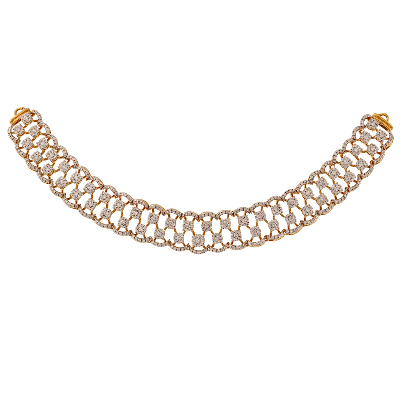 **Diamond Necklace in Zigzag Pattern with Curvy Semi-Circular Borders on 18kt Yellow Gold** Introducing a dazzling diamond necklace that effortlessly combines modern design with timeless elegance. This exquisite piece features a unique zigzag pattern adorned with brilliant diamonds, all set in luxurious 18kt yellow gold. The curvy semi-circular borders add a touch of sophistication, creating a harmonious blend of geometric and fluid lines. Perfect for making a statement, this necklace is designed to catch the eye and elevate any ensemble. Whether for a special occasion or to add a touch of glamour to your everyday look, this diamond necklace is a testament to impeccable craftsmanship and style. Let its captivating design and radiant sparkle be the highlight of your jewelry collection.