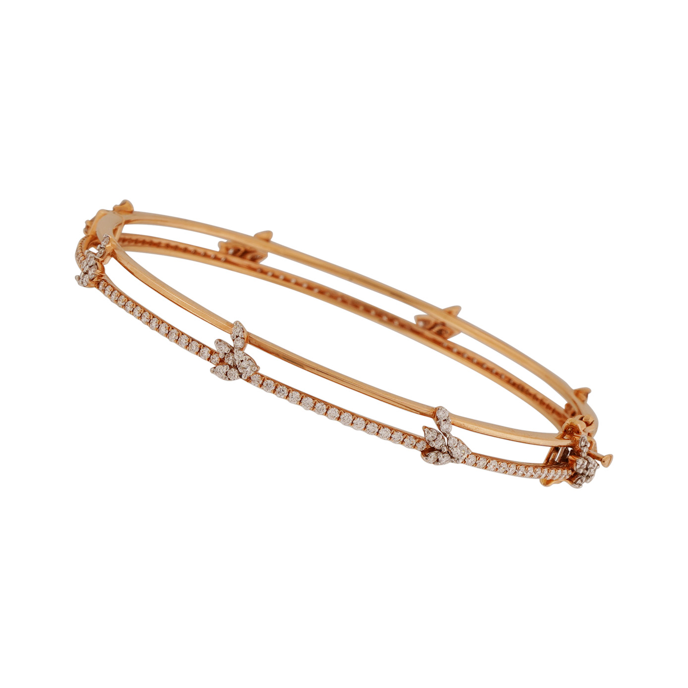**Single Bangle with Double Rims: Diamond-Studded and Floral Motif Design** Experience the perfect blend of elegance and charm with this stunning single bangle, crafted with meticulous attention to detail. This exquisite piece features double rims, one of which is studded with brilliant diamonds, creating a radiant and luxurious appeal. The other rim is sleek and plain, adorned with delicate floral motifs interspersed along its length, adding a touch of nature-inspired beauty. Crafted to perfection, this bangle is designed to be both sophisticated and versatile, making it ideal for any occasion. Whether worn alone or stacked with other pieces, it adds a unique touch of elegance to your jewelry collection. Embrace the timeless allure of this bangle, where sparkling diamonds and graceful floral designs come together in perfect harmony.