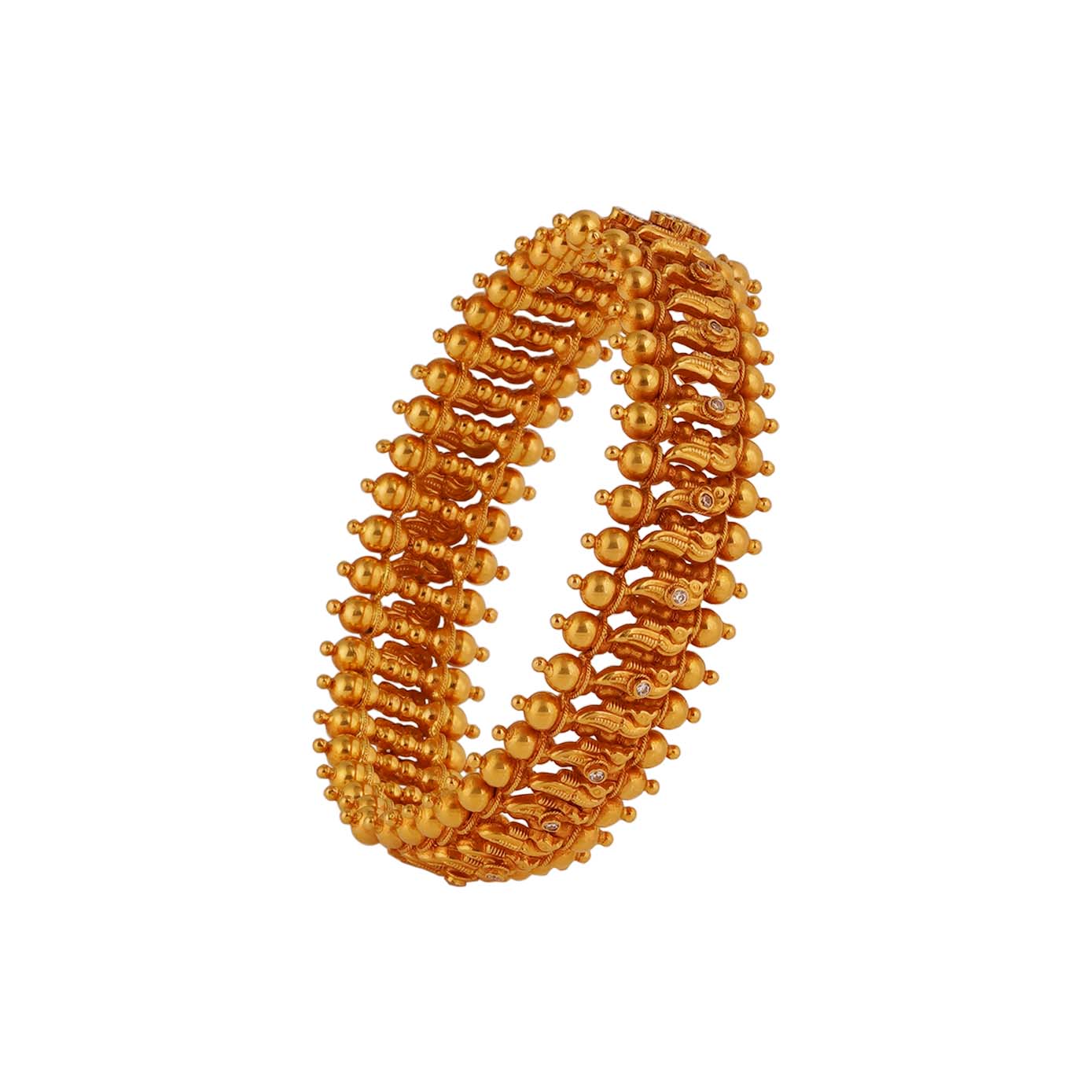 Elevate your style with this exquisite 22kt antique yellow gold kada, designed to elegantly embrace slender hands. The kada features intricate gold beads adorning the borders, adding a touch of sophistication, while the beautifully crafted petals at the center showcase intricate artistry. Studded with shimmering zircons, this piece captures light with every movement, making it a stunning statement accessory for any occasion. Perfect for those who appreciate the blend of traditional craftsmanship and modern elegance.