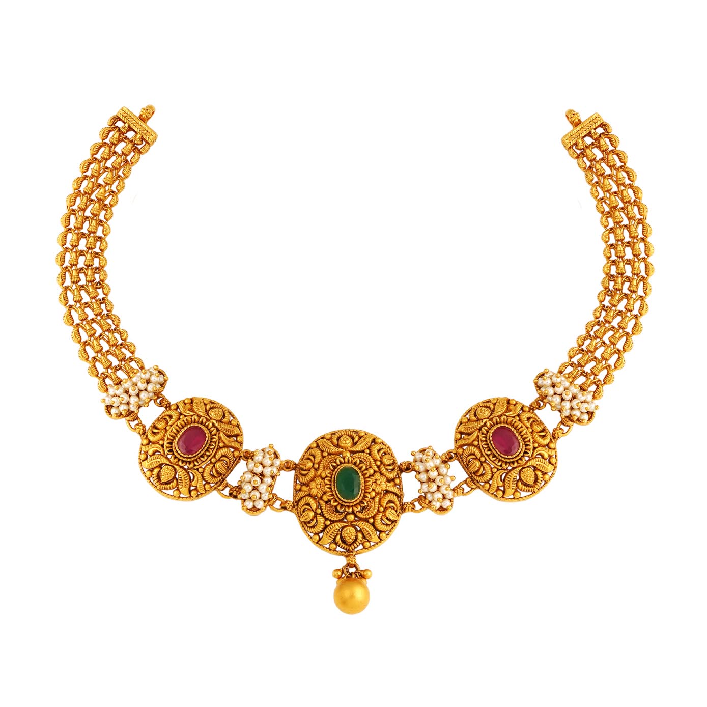 Adorn yourself with the timeless elegance of this gold necklace, featuring a trio of exquisite oval filigree motifs as its centerpiece. The central motif is gracefully studded with a radiant emerald, while the two side motifs dazzle with vibrant rubies. Delicately linked with lustrous pearl connectors, the motifs exude an air of sophistication and charm. The necklace is completed with a four-line braided gold chain, adding a touch of grandeur to this masterpiece. Perfect for those who cherish intricate craftsmanship and a blend of classic and contemporary design.