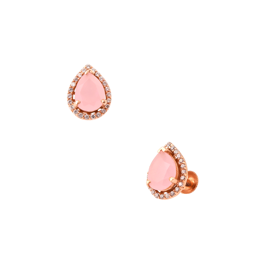 Delicate yet striking, these teardrop-shaped studs feature a soft pink stone held securely in an 18kt rose gold bracket. The center is beautifully framed with a shimmering outline of fine white zircons, adding a radiant touch of sparkle. Designed with a traditional Indian screw back for a secure and comfortable fit, these studs blend contemporary charm with classic detailing—perfect for both daily elegance and special occasions.