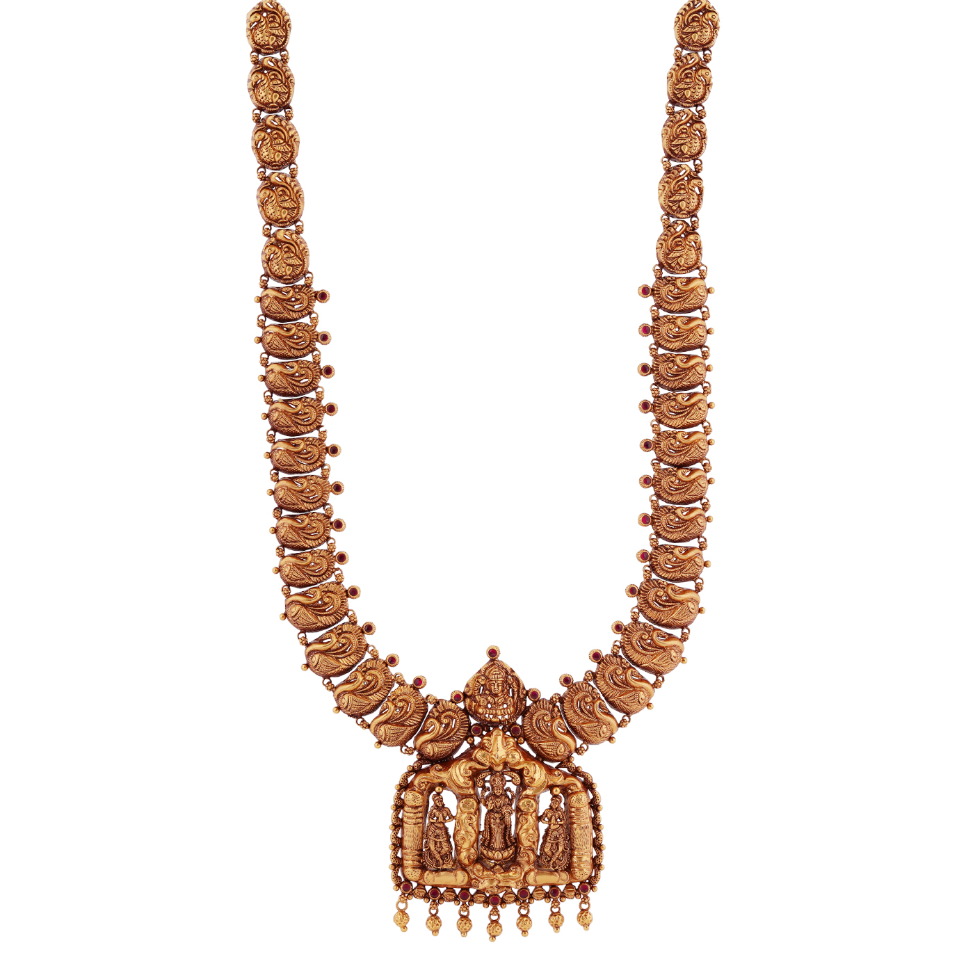 Peacocks are one of the evergreen designs from which to choose. This gold haram incorporates not only the peacock motif but also the standing Lakshmi and Devis in the center to bestow prosperity and flourish. The specialty of this jewel is the pegged inscriptions on the pendant to show the depth of the craftsmanship, making this an exclusive piece.