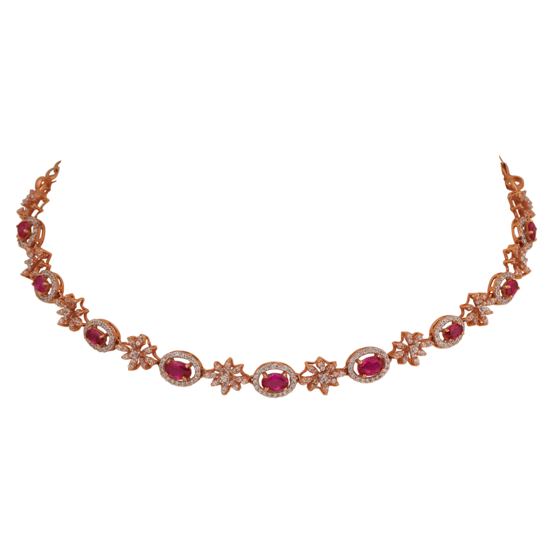 Elegantly crafted in 18KT rose gold, this exquisite collar necklace is designed as a graceful vine of blooming flowers, intertwined with oval-shaped motifs for a touch of symmetry. Each oval motif features a vibrant pink stone at its center, adding a romantic pop of color to the warm rose gold hue. The seamless flow of floral elements and geometric accents creates a harmonious balance of nature-inspired beauty and refined artistry, making it a captivating choice for both special occasions and elegant evenings.
