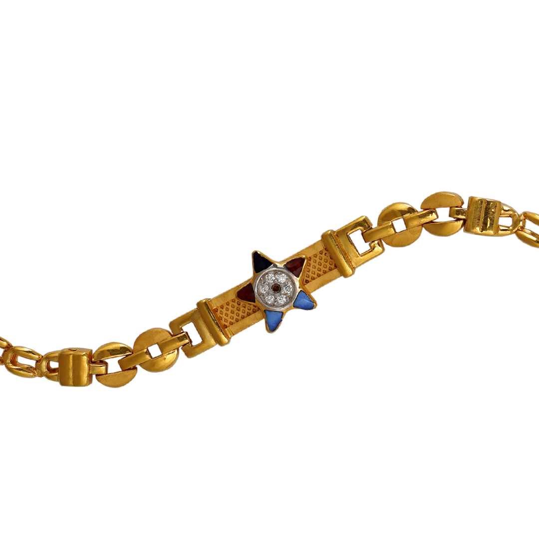 Delicately crafted in 22kt gold, this adorable baby bracelet features a colorful enamel star as the central motif, symbolizing brightness and joy. The simple yet elegant chain-type design ensures comfort and ease for tiny wrists, making it a perfect blend of safety, charm, and timeless style. A precious keepsake to celebrate the little star in your life. 🌟