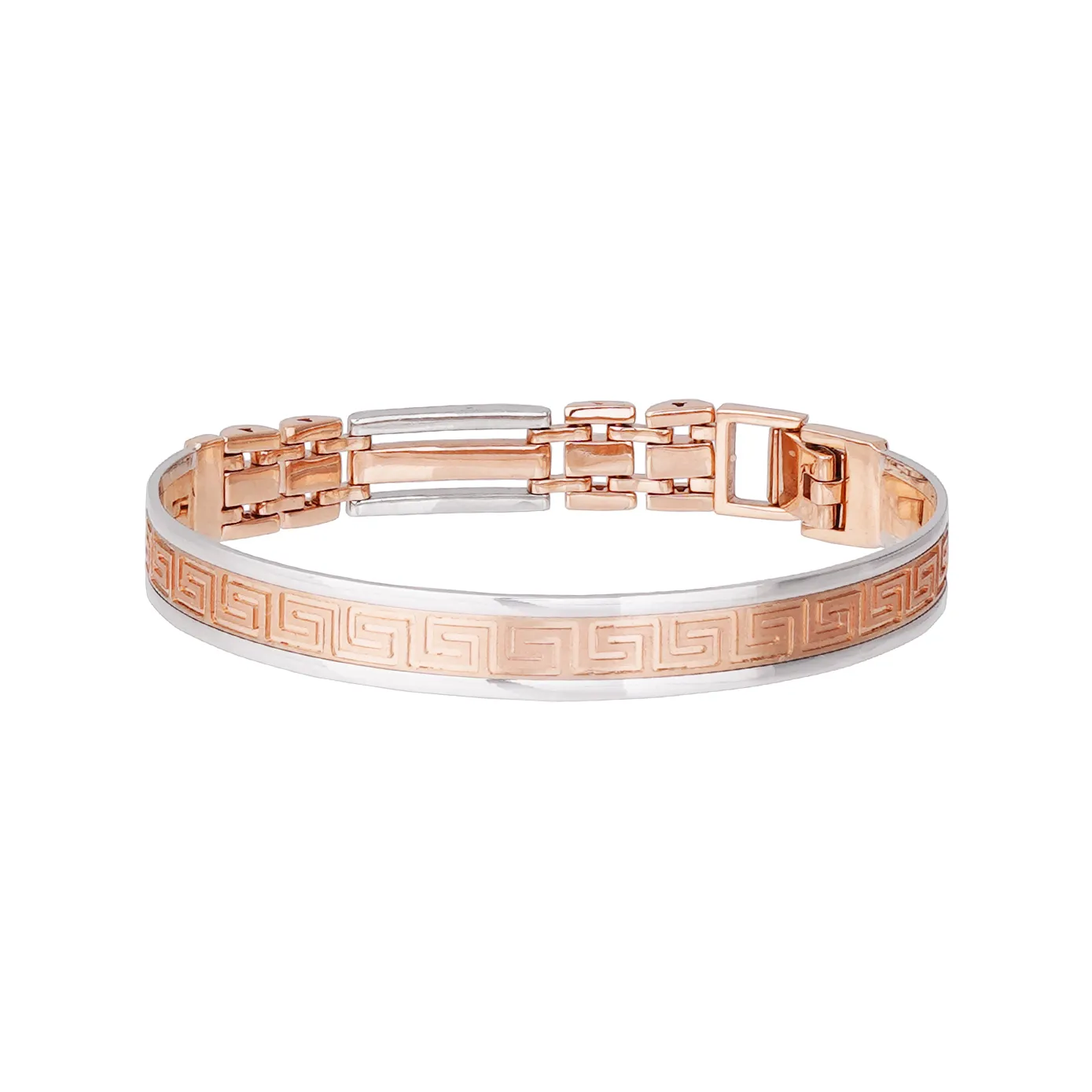A beautiful eye pleasing western style bracelet, a best catch to gift your best man. Let this amalgamation of platinum and 18k rose gold with special S grooved clip styled bracelet.