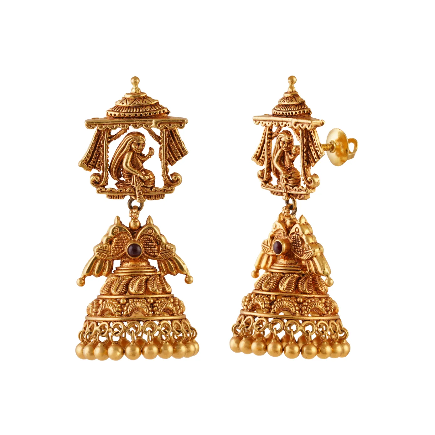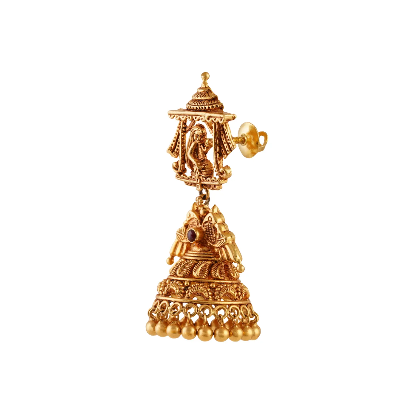 An extraordinary design of Lakshmi in the Pallakku is set at the stud piece, while peacocks and motif designs adorn the dome part of the Jhumka. The single Kemp stone is depicted as a beauty mark to this eye-catching gold earring that you must have.