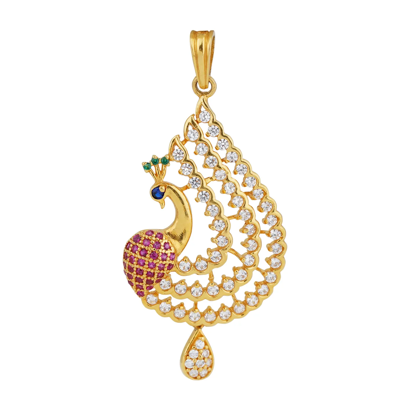 The epitome of elegance and grace dances in the vivid plumes of zircon stones. The intensity only multiplies with the brilliant blue, red, and green stones that are fixed to the bright yellow gold. It is a masterpiece of its kind. Peck a set of dazzling earrings along with the pendant.