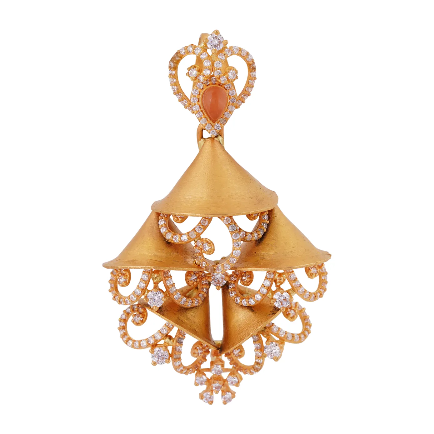 The sound of the holy bells uplifts the spirit in an instant. The matte-finished gold cones are held together by zircon-fixed gold strings that emerge from within them. This easily becomes a remarkable item to add to your unique collections. Hang these echo-less chime earrings with their matching pendant.