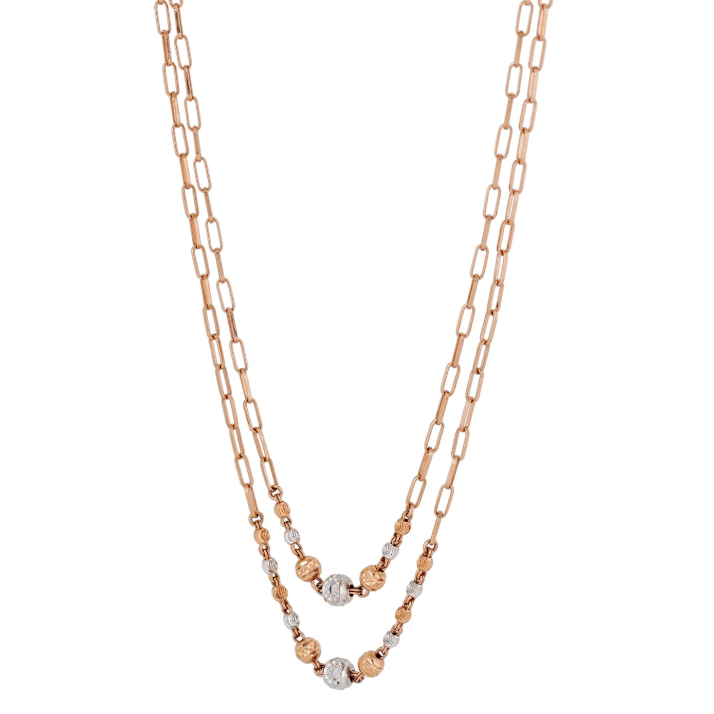 The finest mixture of rhodium and rose gold with excellent carvings on it will make you center of attraction in the occasions you be. Tiny balls are carved with beautiful cuts and added to paper clip chains, finishes the look.