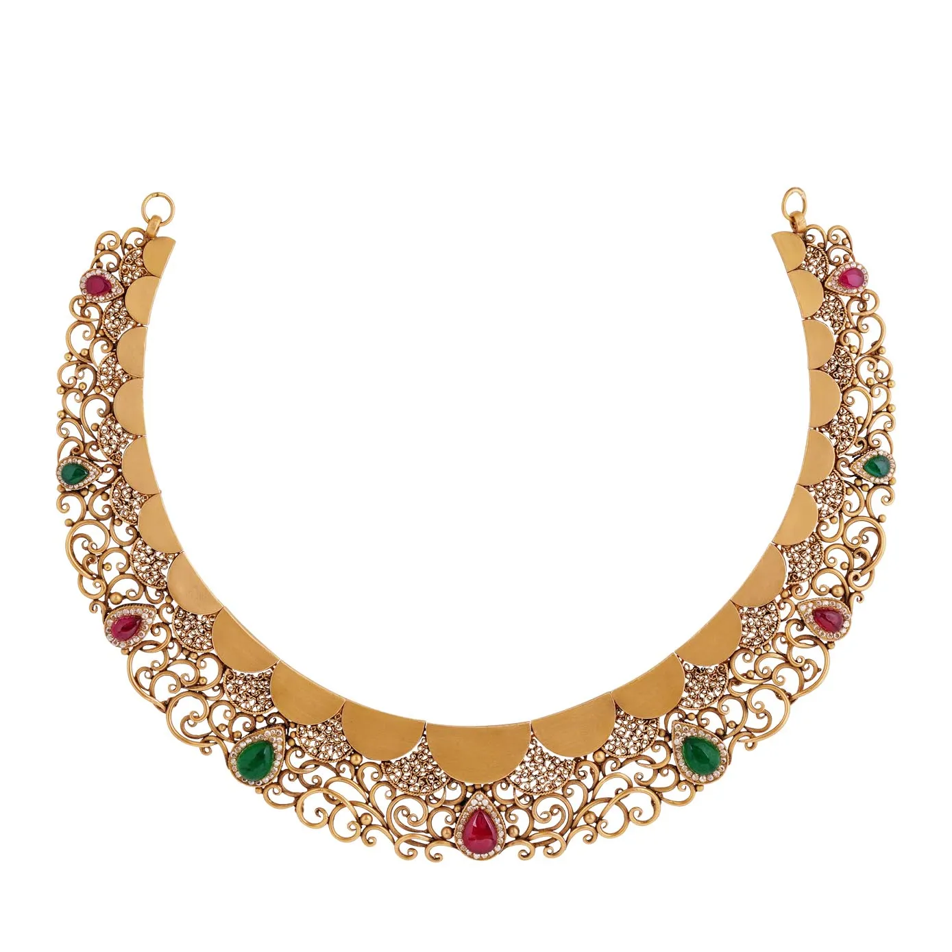 A beautiful semi circular half moon shaped layer extended with filigreed ovals and followed by the ivy vined unevenly with some pink and green color stones on it, makes this a distinguished party wear. This ensemble promises to catch the eyes of everyone looks on to it.