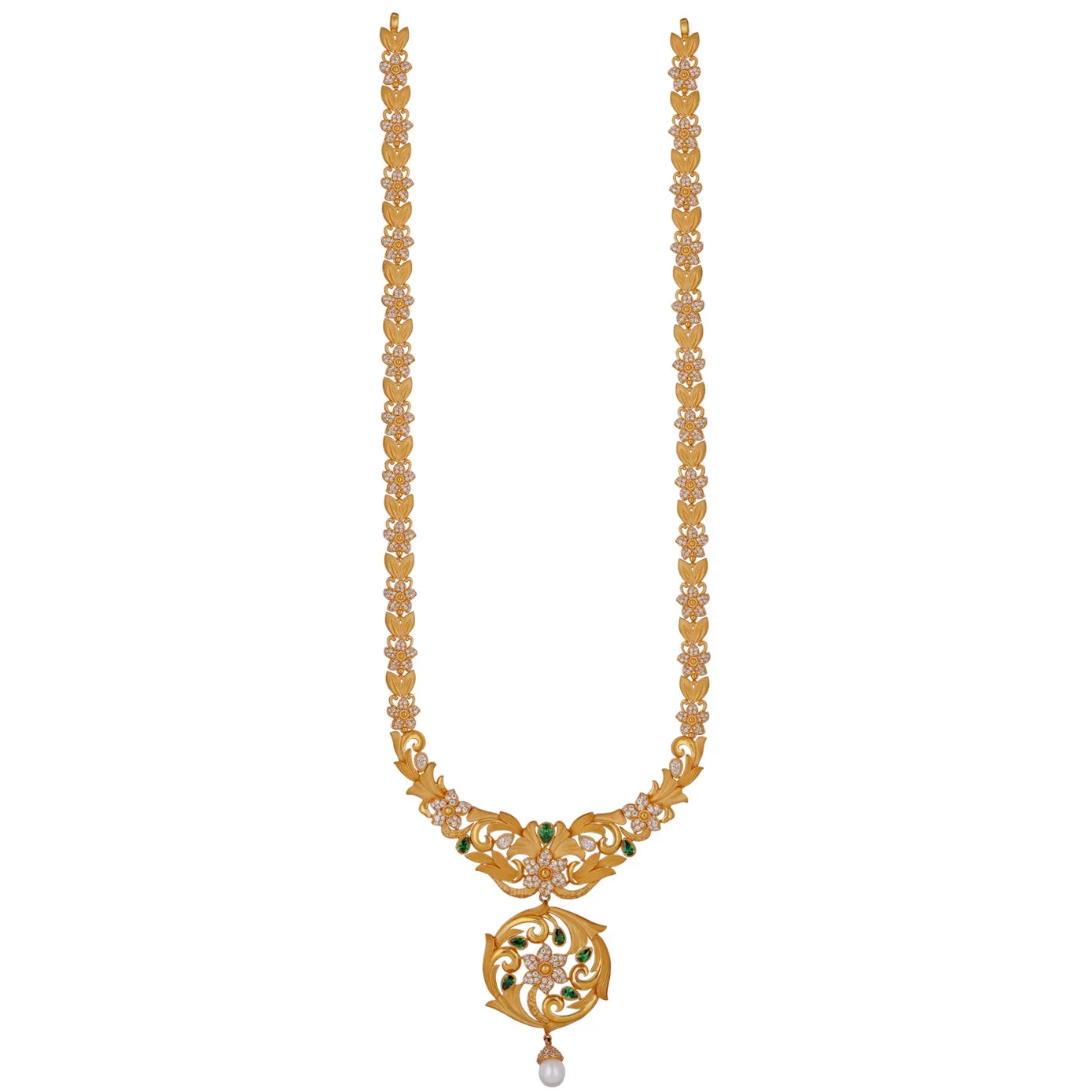 A sleek haram that goes out with trendy attributes along with floral designs is a new flourish in recent collections. The white and green stones are a serene combination that is accentuated with a pearl drop at the bottom.
