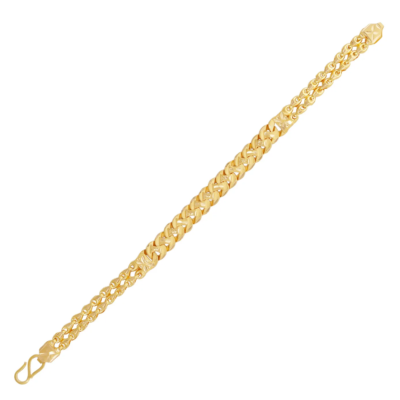 Aligned together with circular clips clipped together and joined with chain loops and fastened with S-hook made of 22k gold to be wounded around the handsome hunk's hand.