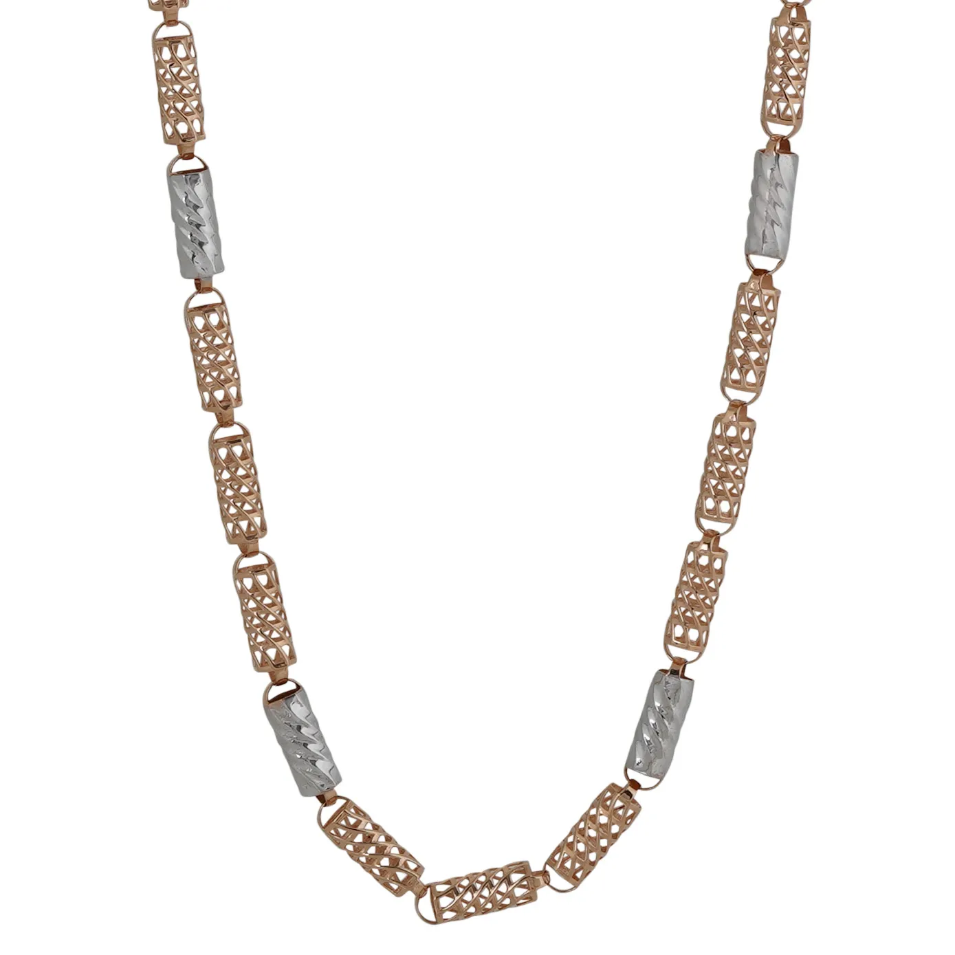 Get this to flaunt your charm and impress your loved ones. A fresh design to the 18k category with the amalgamation of two unique metals like rose gold and rhodium in a special meshed cylindrical beads.