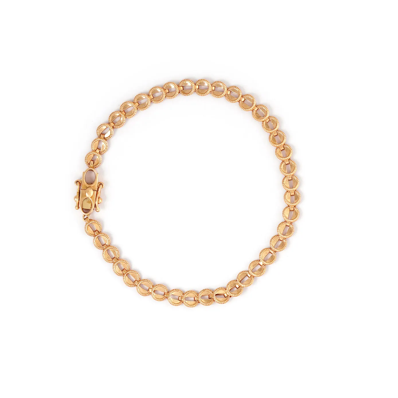 A distinctive and captivating circular pattern, meticulously crafted from the resplendent essence of 22k gold, presents itself as the epitome of elegance, destined to grace the attire of any woman seeking to infuse her ensembles with a refined allure. This gold bracelet boasts an exquisite design, featuring a lock that is truly one-of-a-kind, fashioned to gracefully clasp onto delicate wrists with its unique and gentle embrace. This singular piece is not merely an accessory; it's a statement of individuality, an embodiment of sophistication, and an exquisite testament to the art of jewelry.
