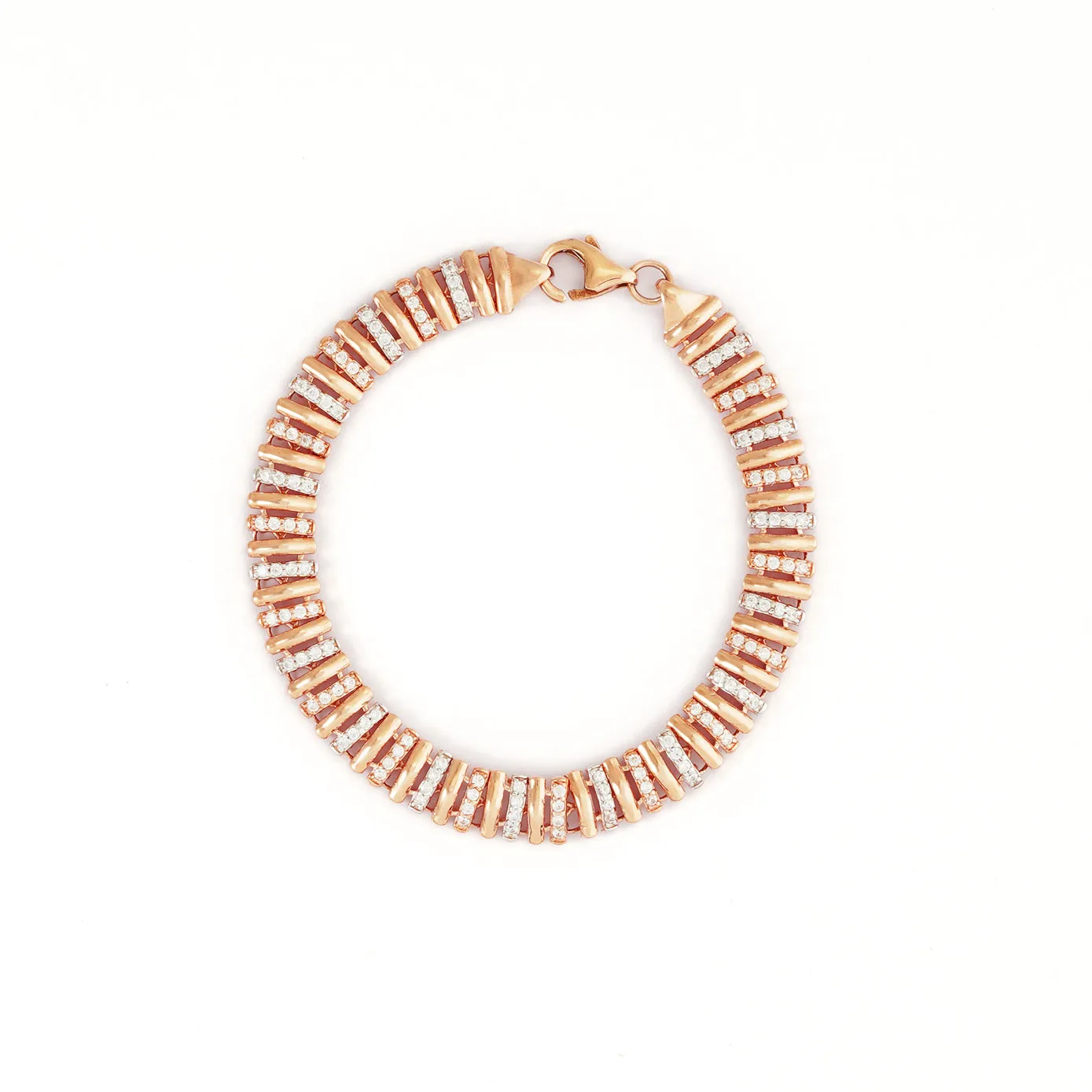 An enticing 18k rose gold with a unique train of rose gold blocks and zircon studded blocks together with extra care. This bracelet can be paired up with all your attires with an exciting glow to you.
