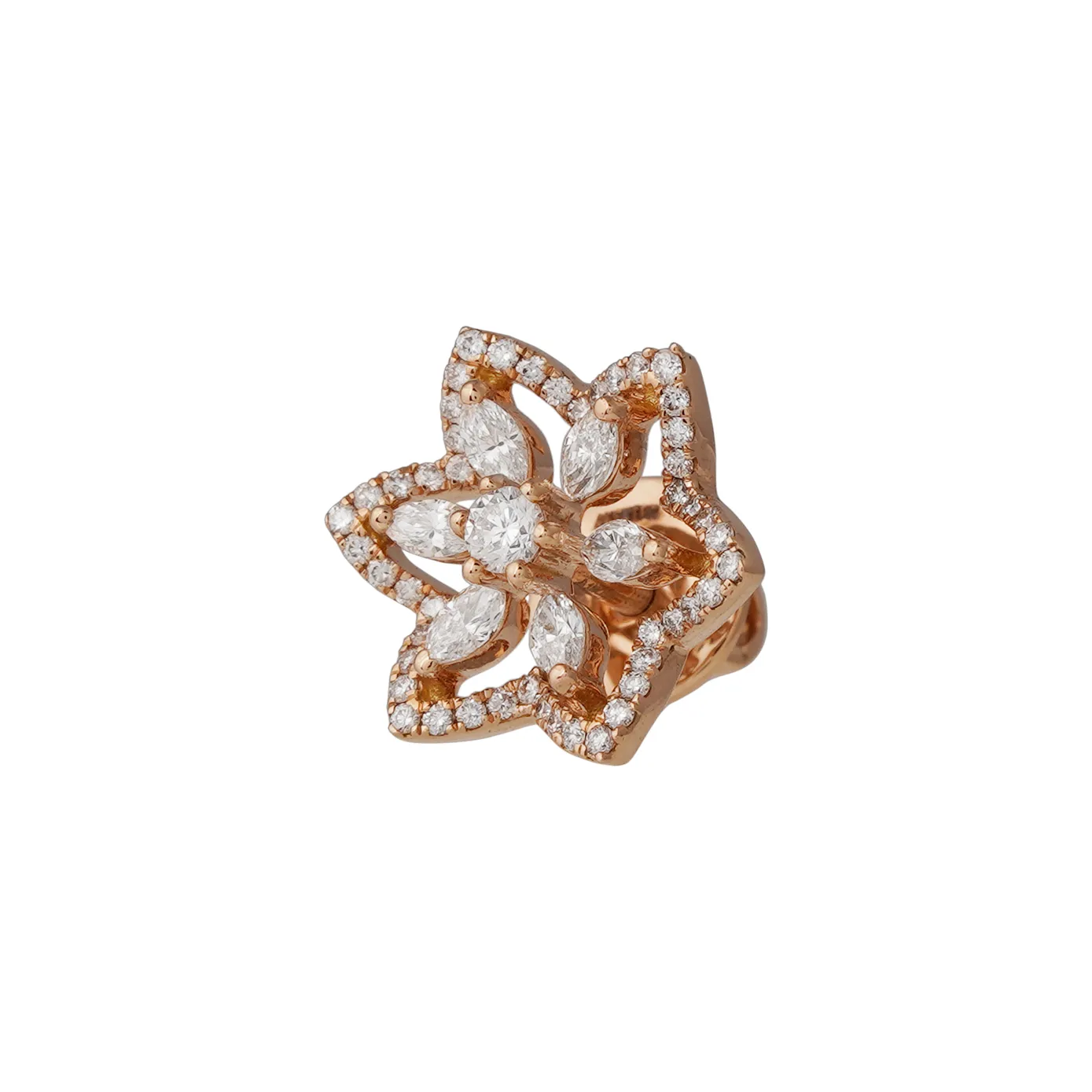Elevate your style with our 18k rose gold floral bloom, a harmonious fusion of modesty and boldness. This exquisite piece, with an open setting, is adorned with petite round-cut diamonds and delicate diamond marquise petals. Crafted to enhance your aesthetic appeal, it's a captivating addition that effortlessly balances subtlety with allure, making it the perfect choice to accentuate your unique style.